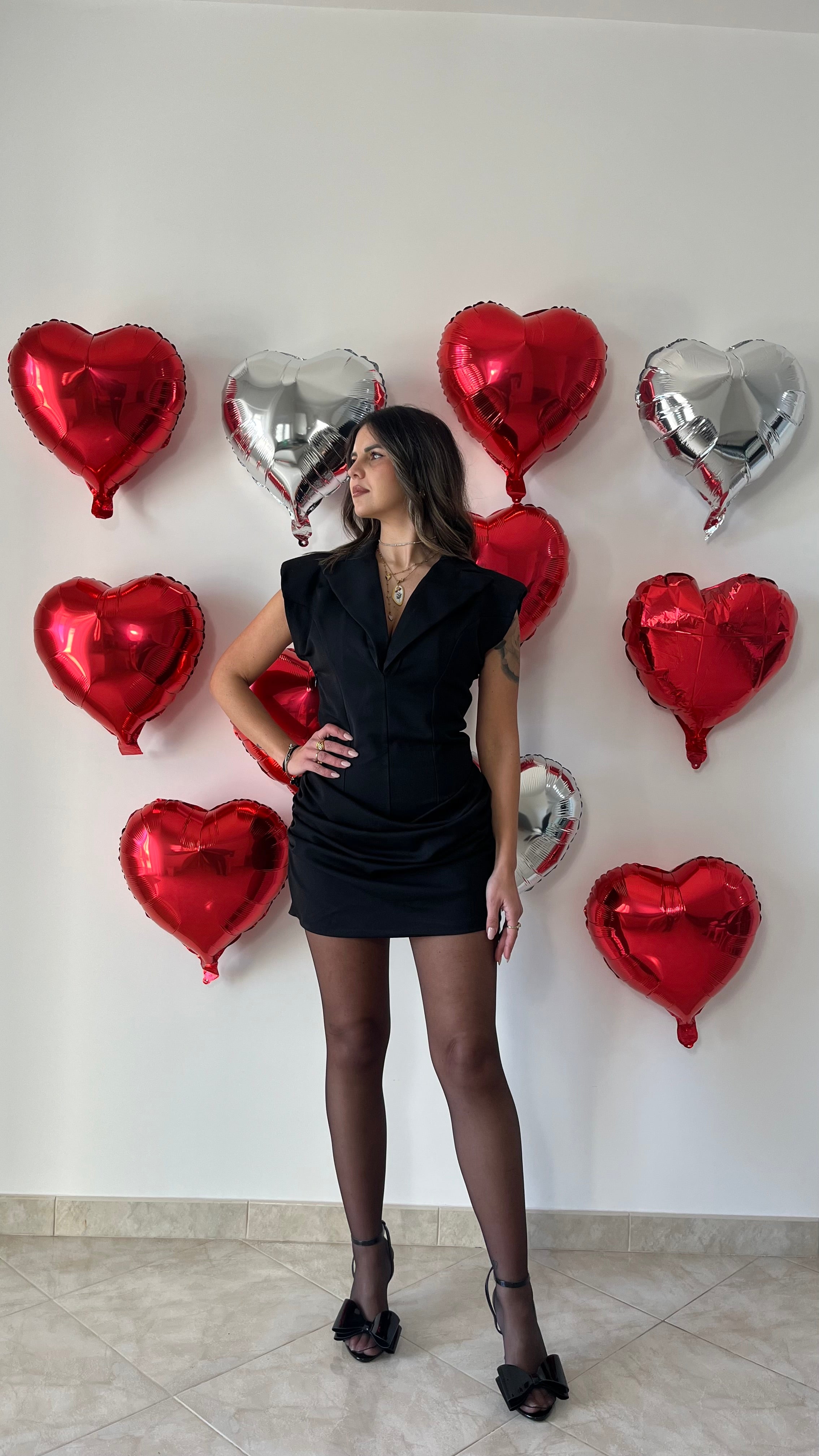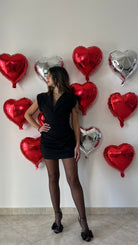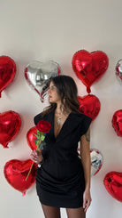 Abito corto con spalline imbottite, scollo a V e drappeggio sulla gonna . Chiusura lampo a lato.