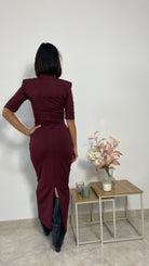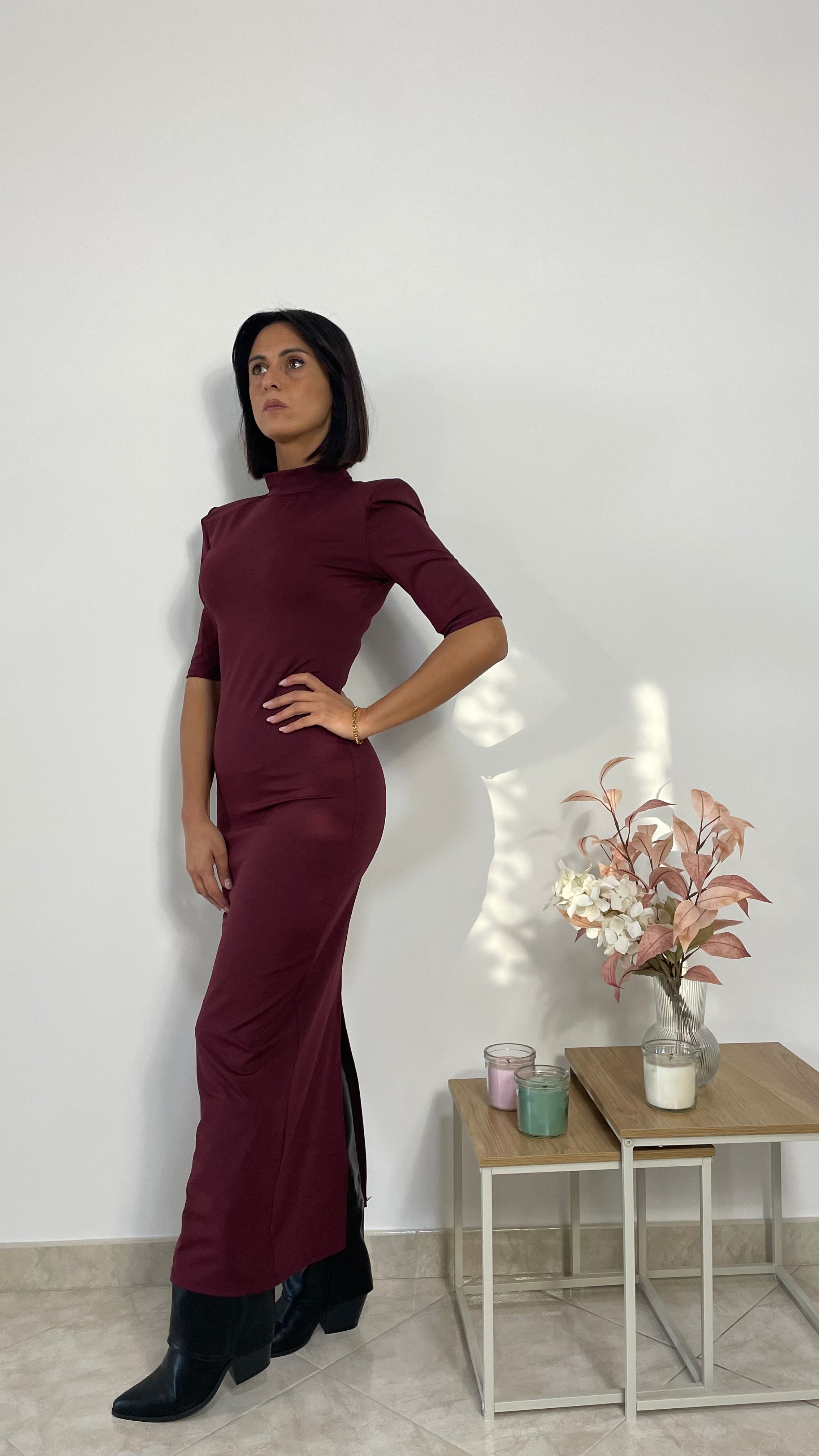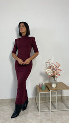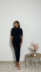 Il nuovo abito Lara è un modello lungo, in tessuto elasticizzato, messo collo e mezza manica con spacco posteriore ad altezza polpacci.