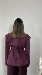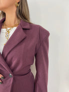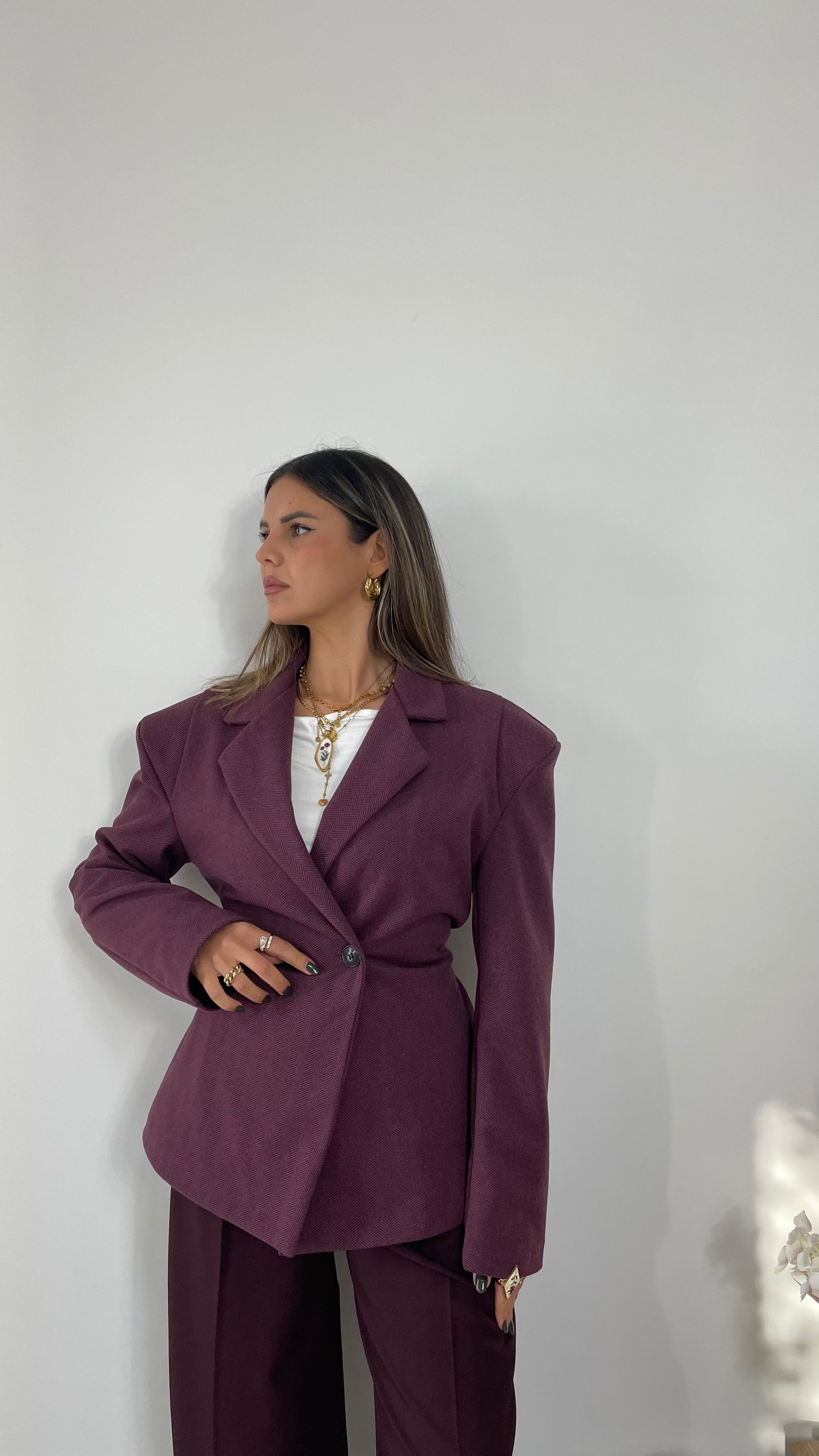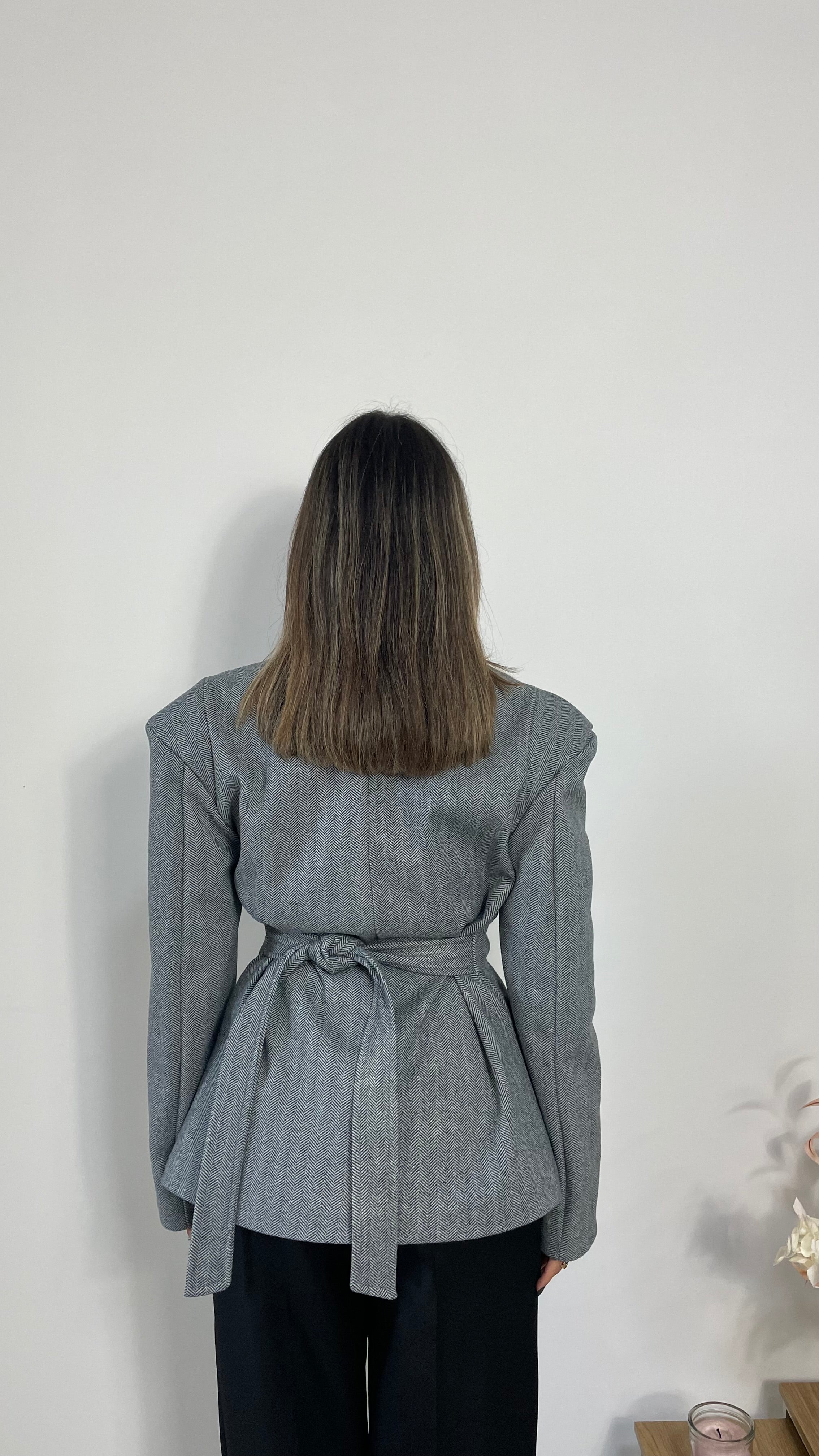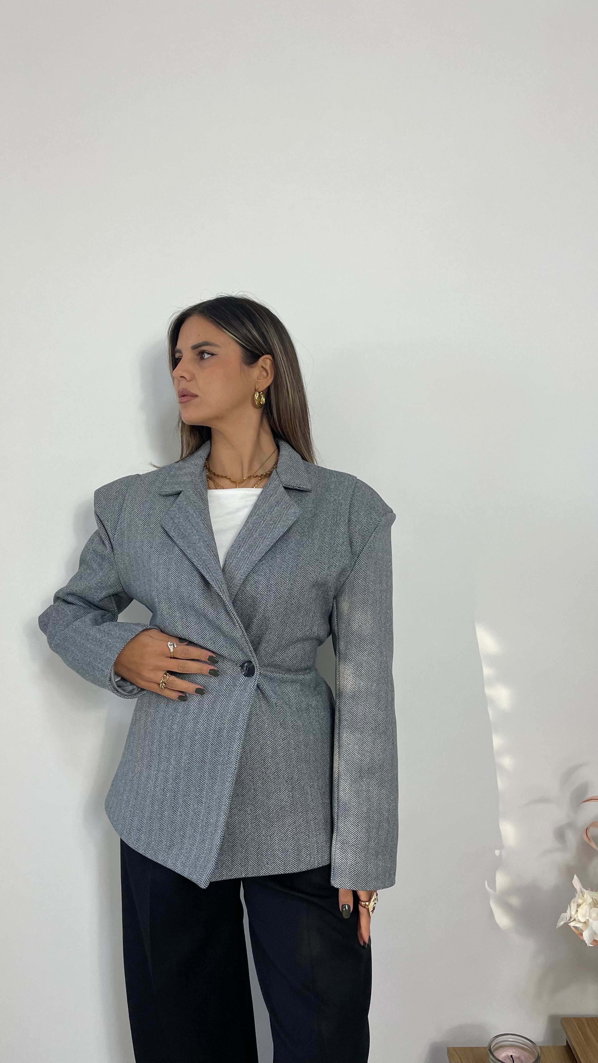 Blazer in lana con spallina imbottita a punta . Il blazer presenta una trama a spina di pesce con un doppio bottone interno ed esterno .