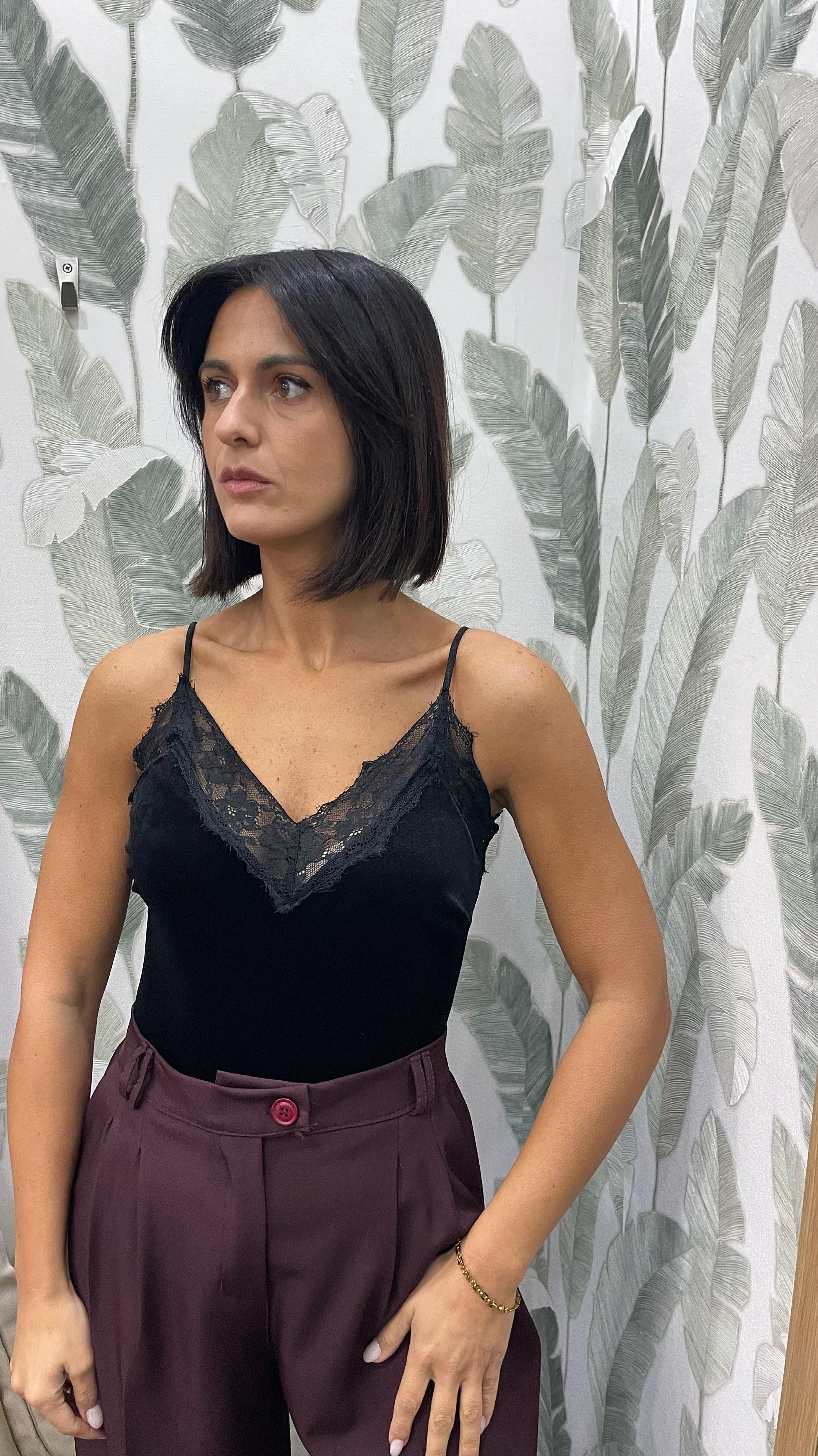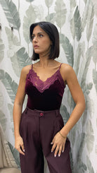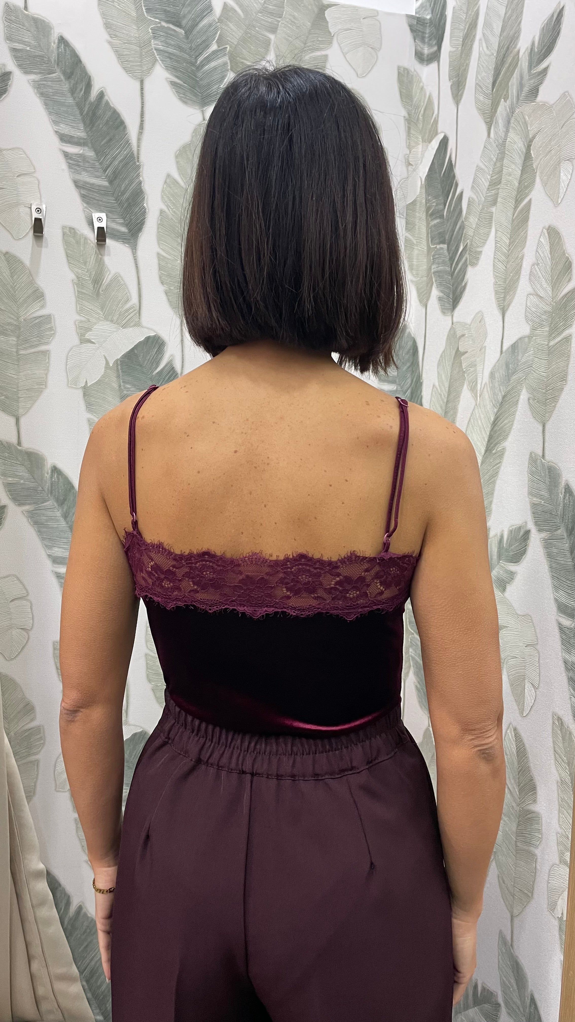 Il nuovo body in velluto ha il dettaglio del pizzo sulla scollatura a V avanti ed indietro.