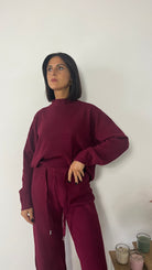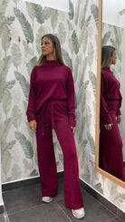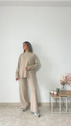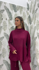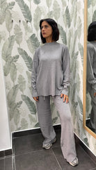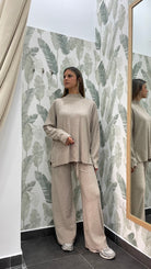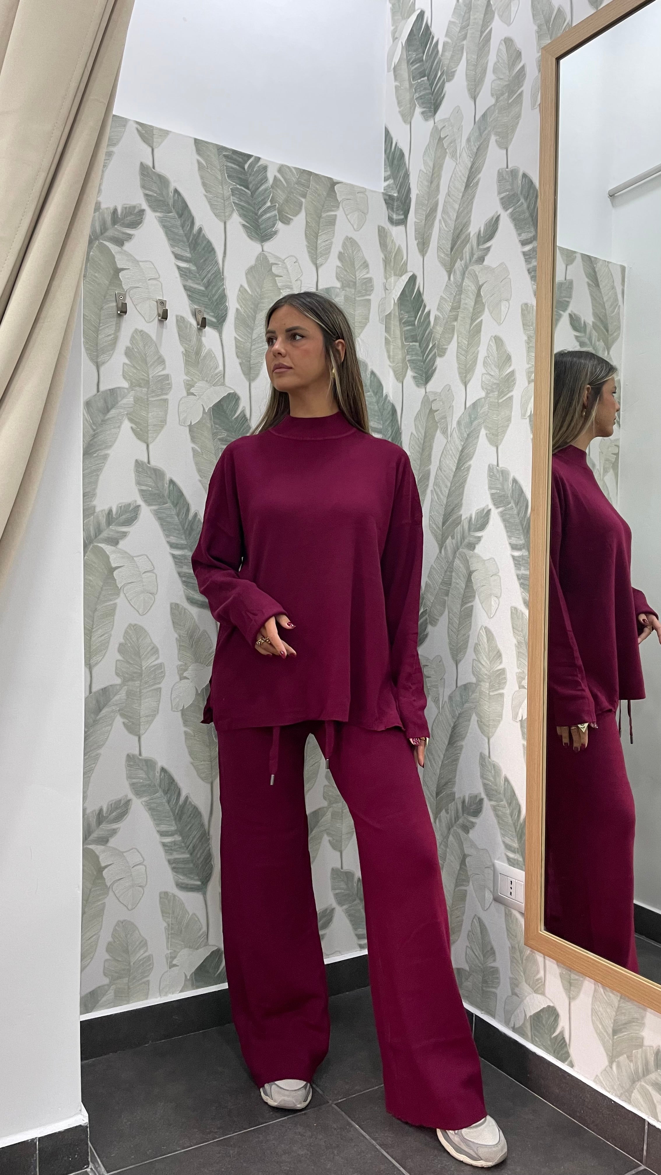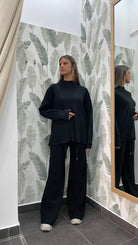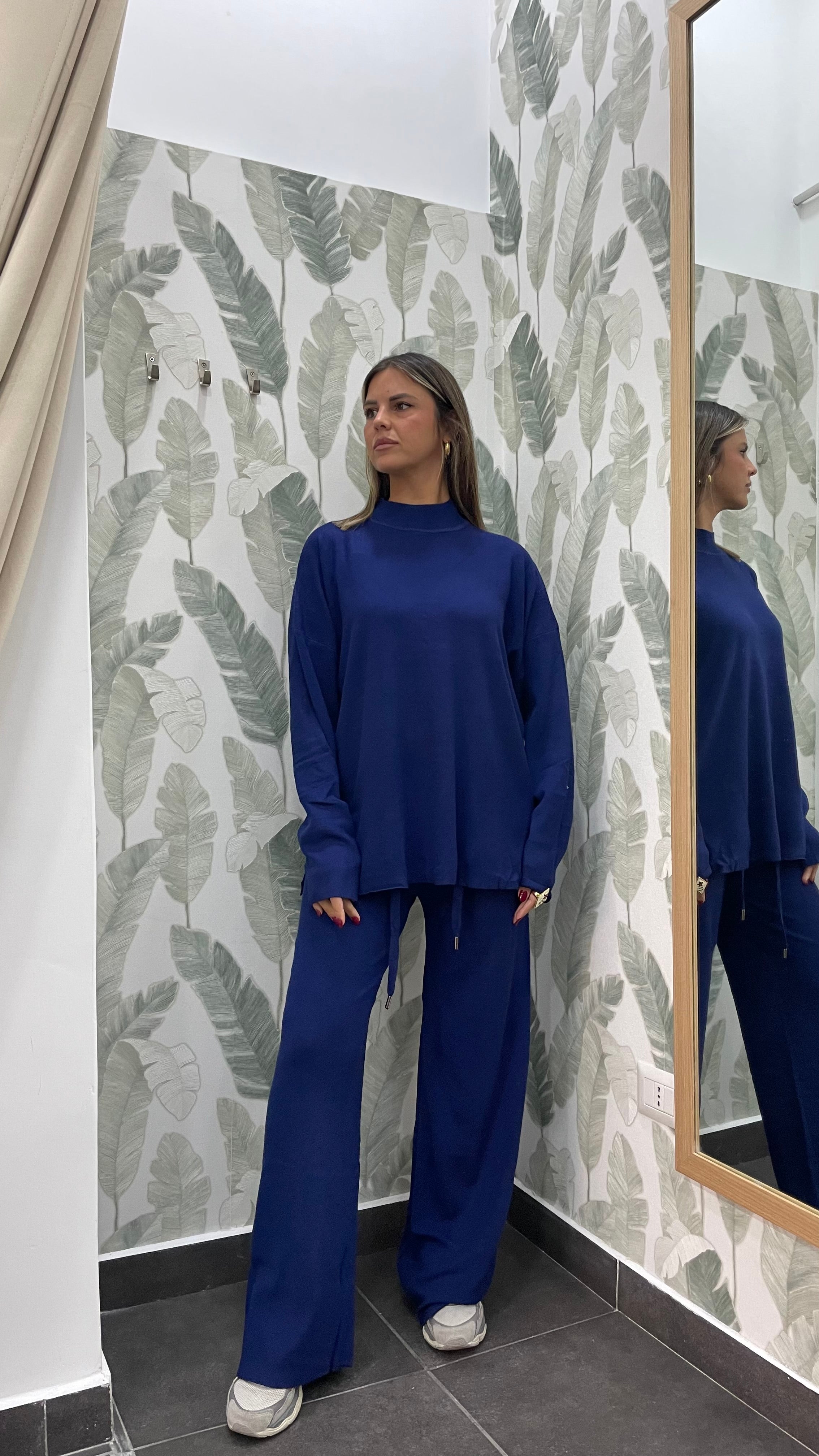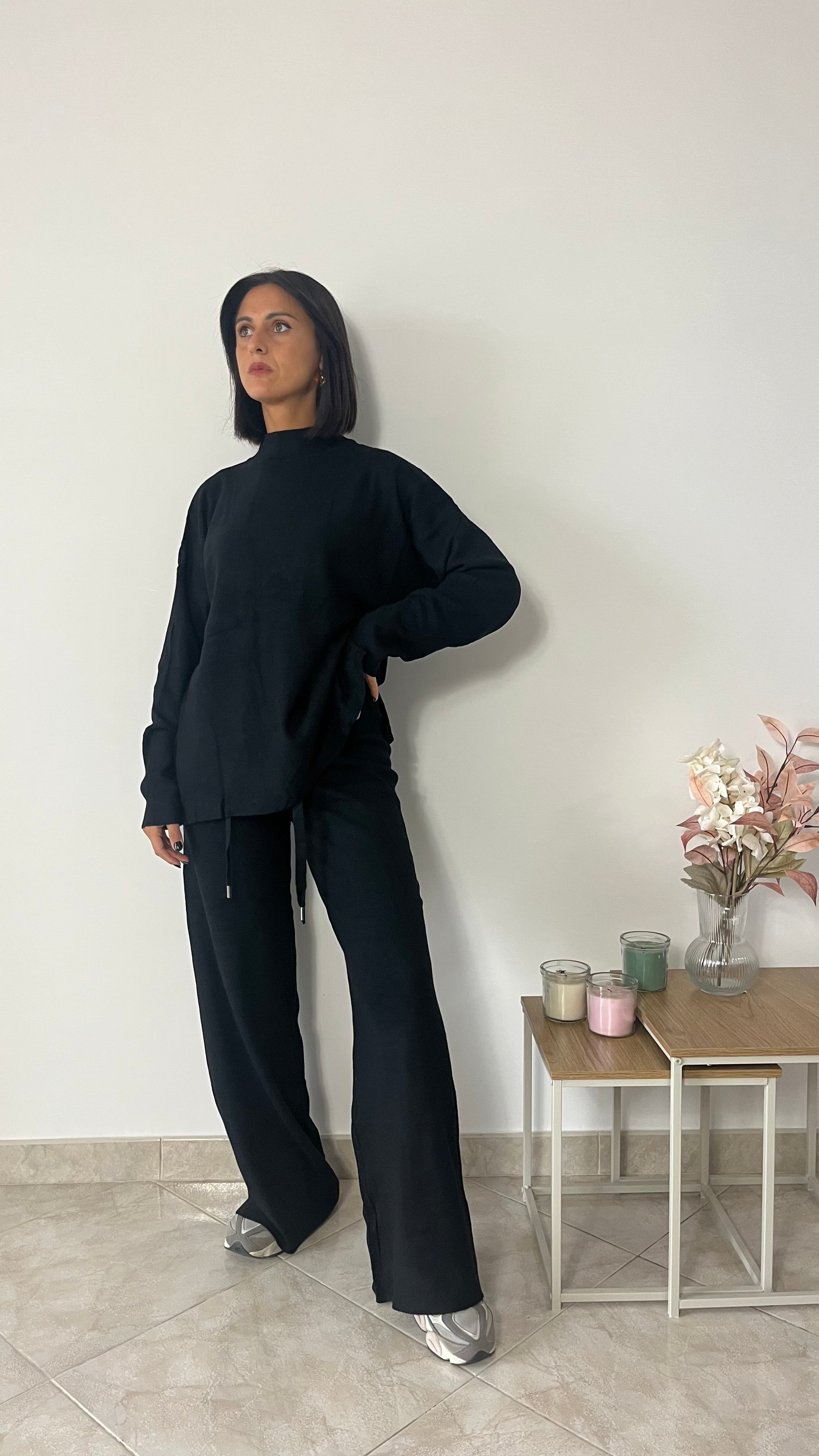 Il coordinato è una taglia unica comoda composto da : maglia larga con mezzocollo e spacchi a lato e pantaloni vita alta,elastico in vita con lacci e fondo largo.
