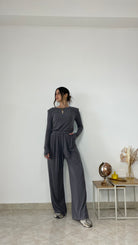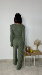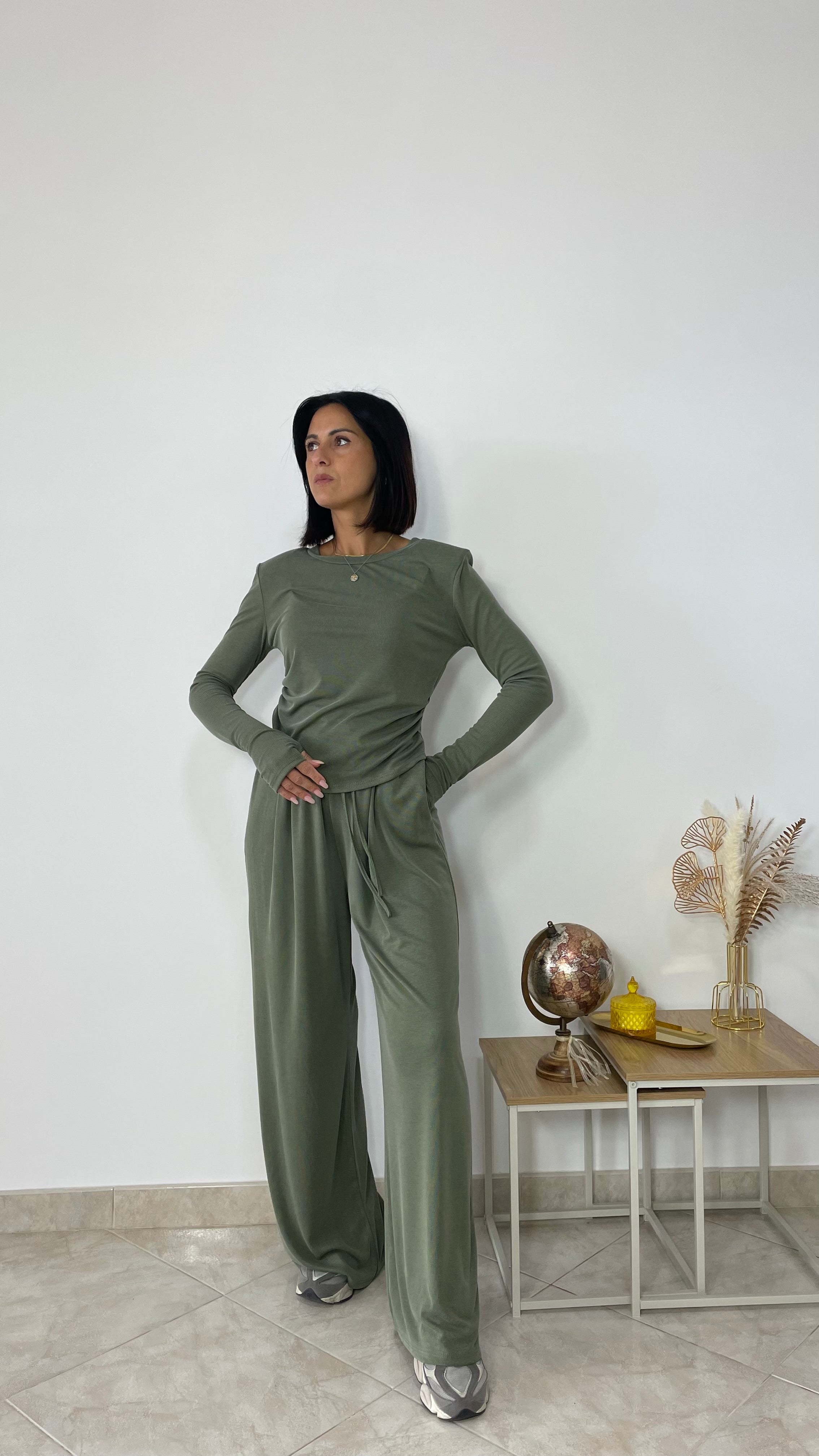 Taglia unica composto da : maglia con spalline e drappeggio sui lati e pantaloni palazzo comodissimi in vita con elastico e laccio, tasche a filo e fondo largo.