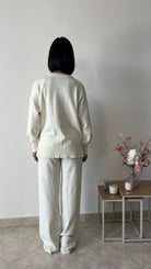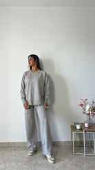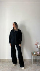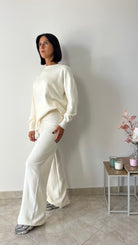 Coordinato composto da maglia girocollo basic e pantaloni fondo largo con elastico e lacci regolabili in vita .