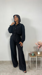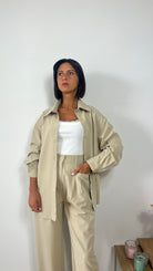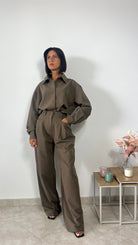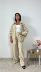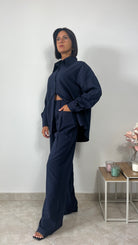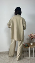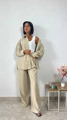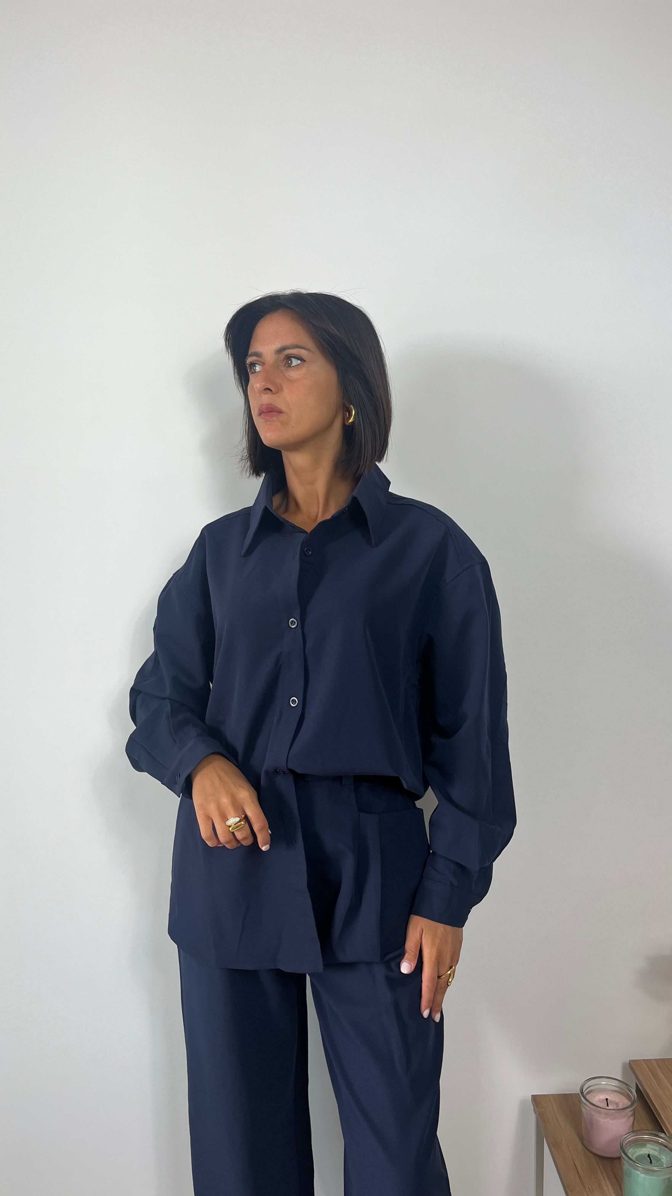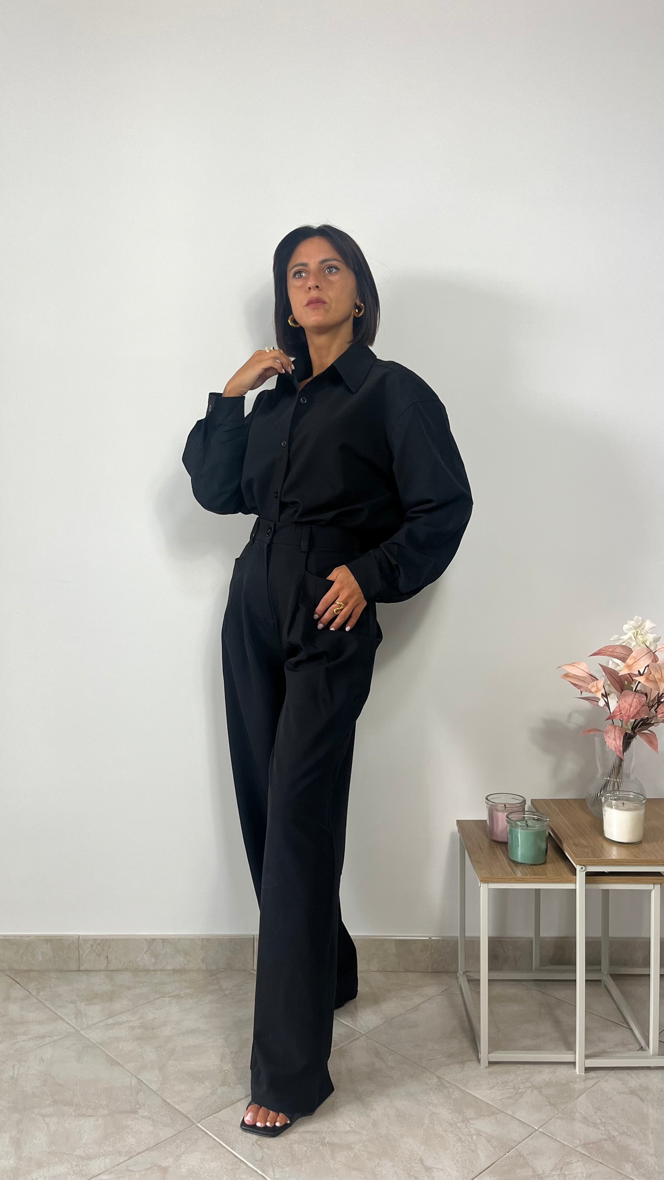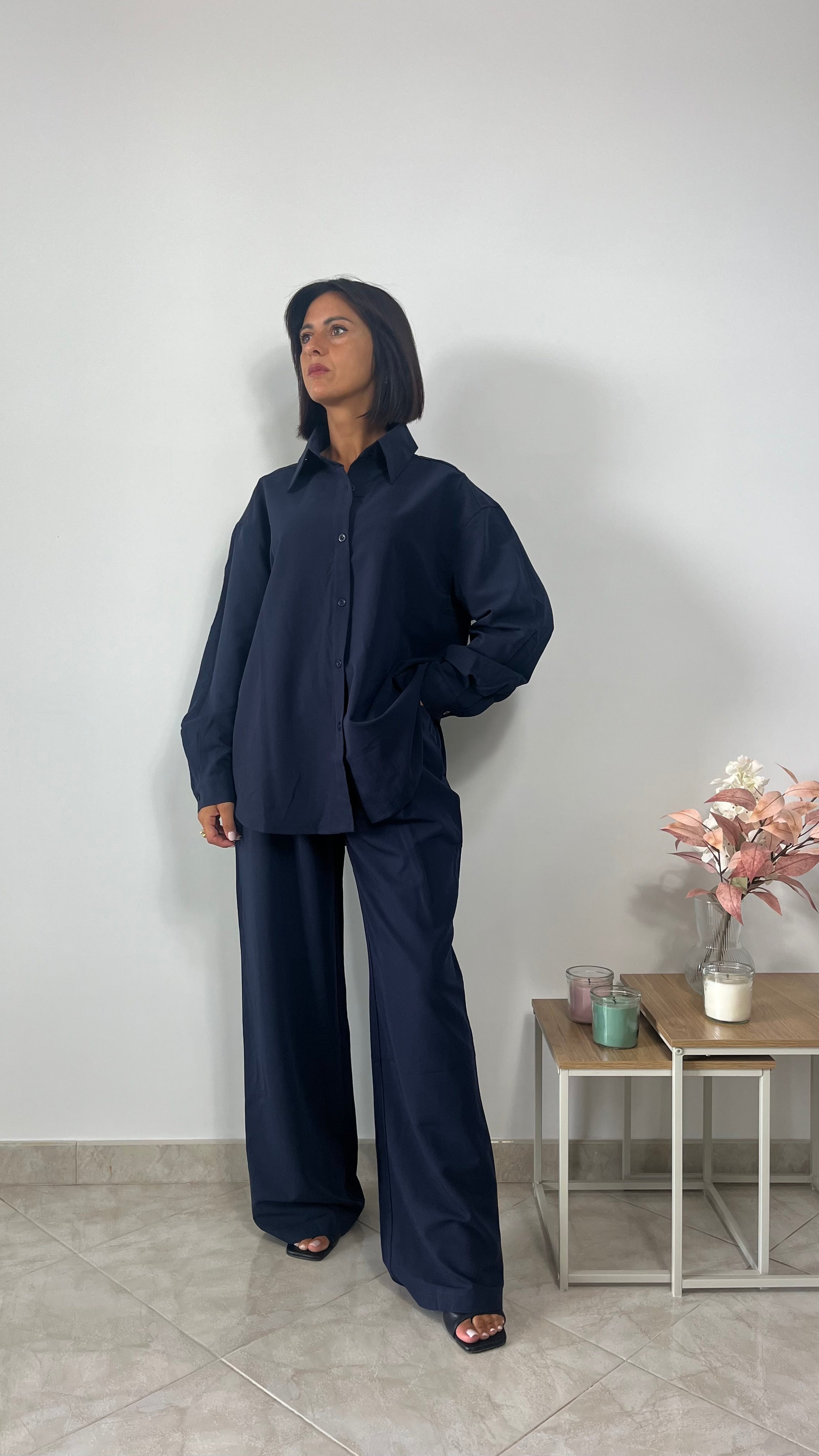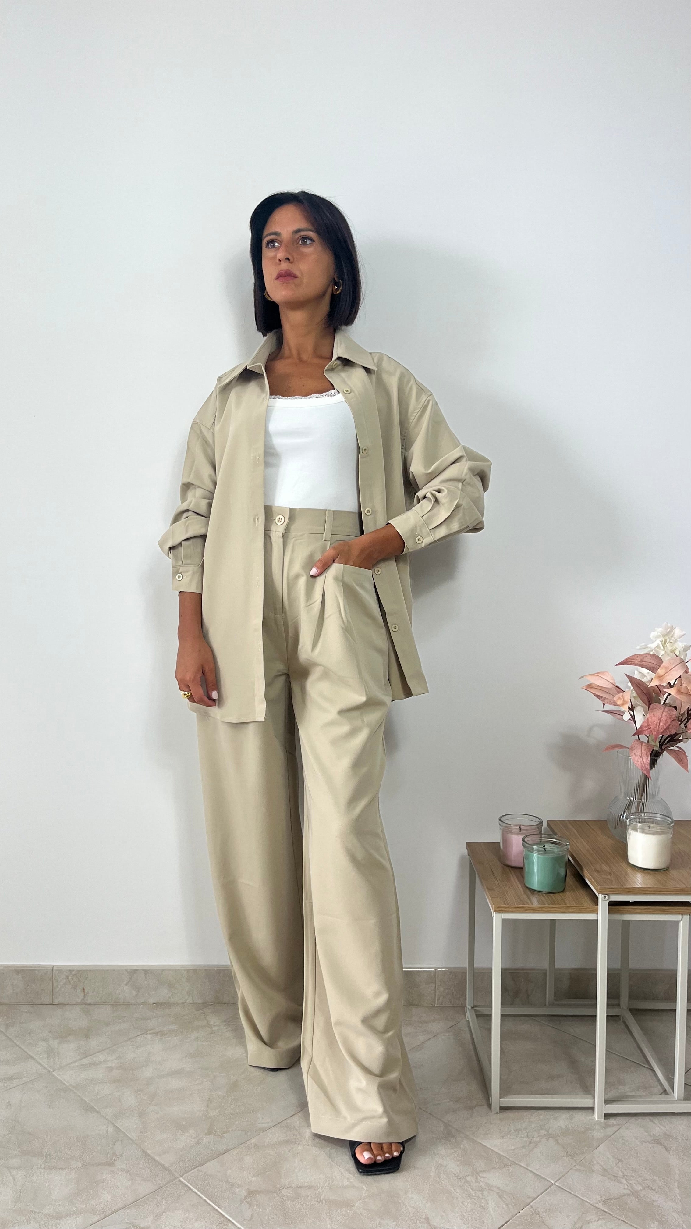 Il coordinato si compone di camicia oversize dal taglio ampio e comodo e pantaloni vita alta con gamba e fondo largo, tasche frontali e chiusura lampo avanti.