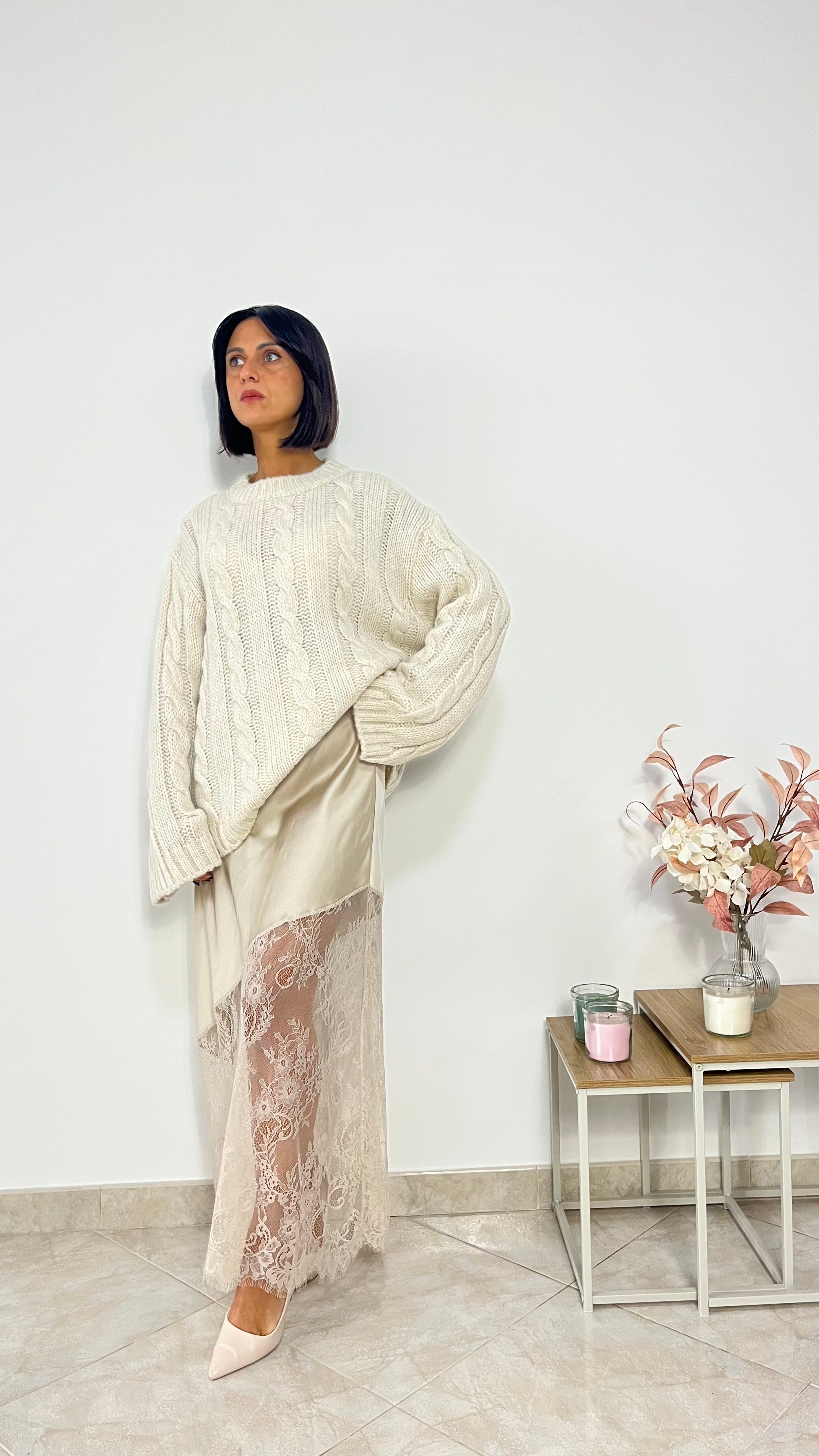 Gonna lunga in raso con fondo in pizzo .