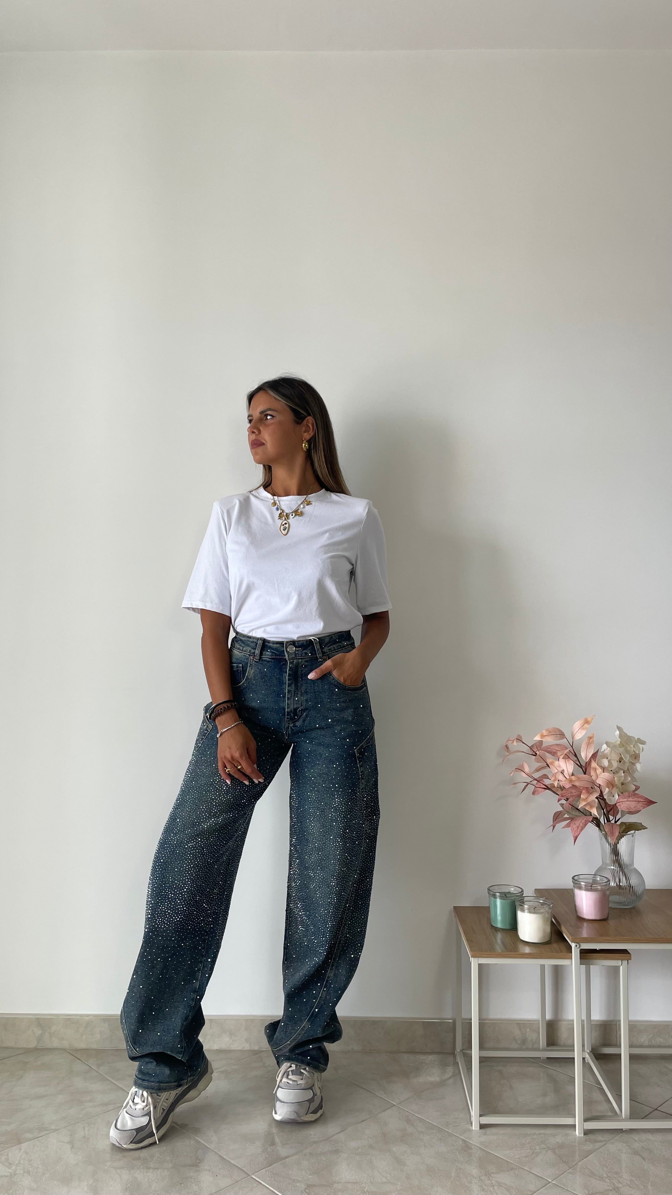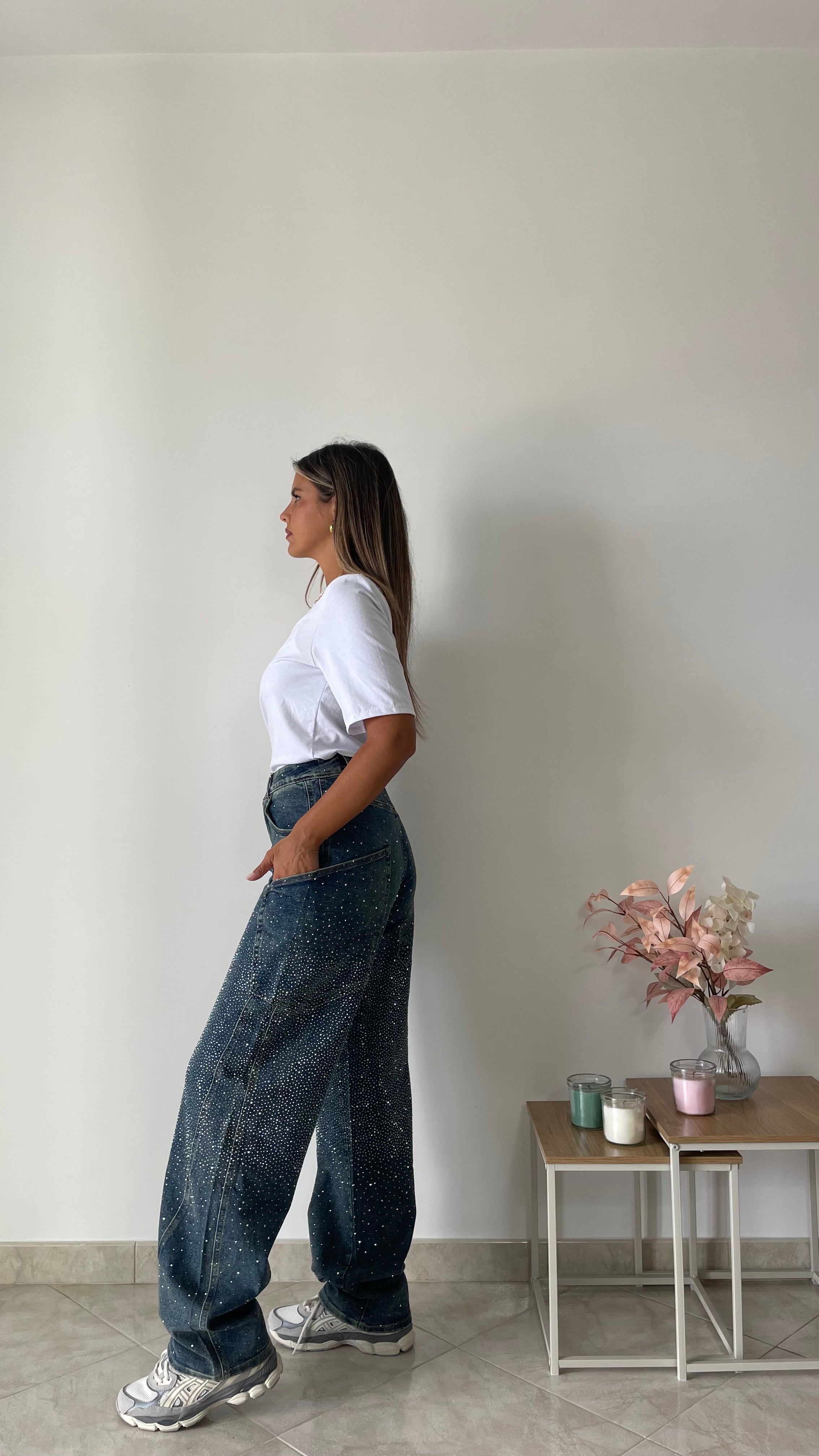 Jeans modello balloon con brillantini , vita alta elasticizzato