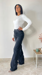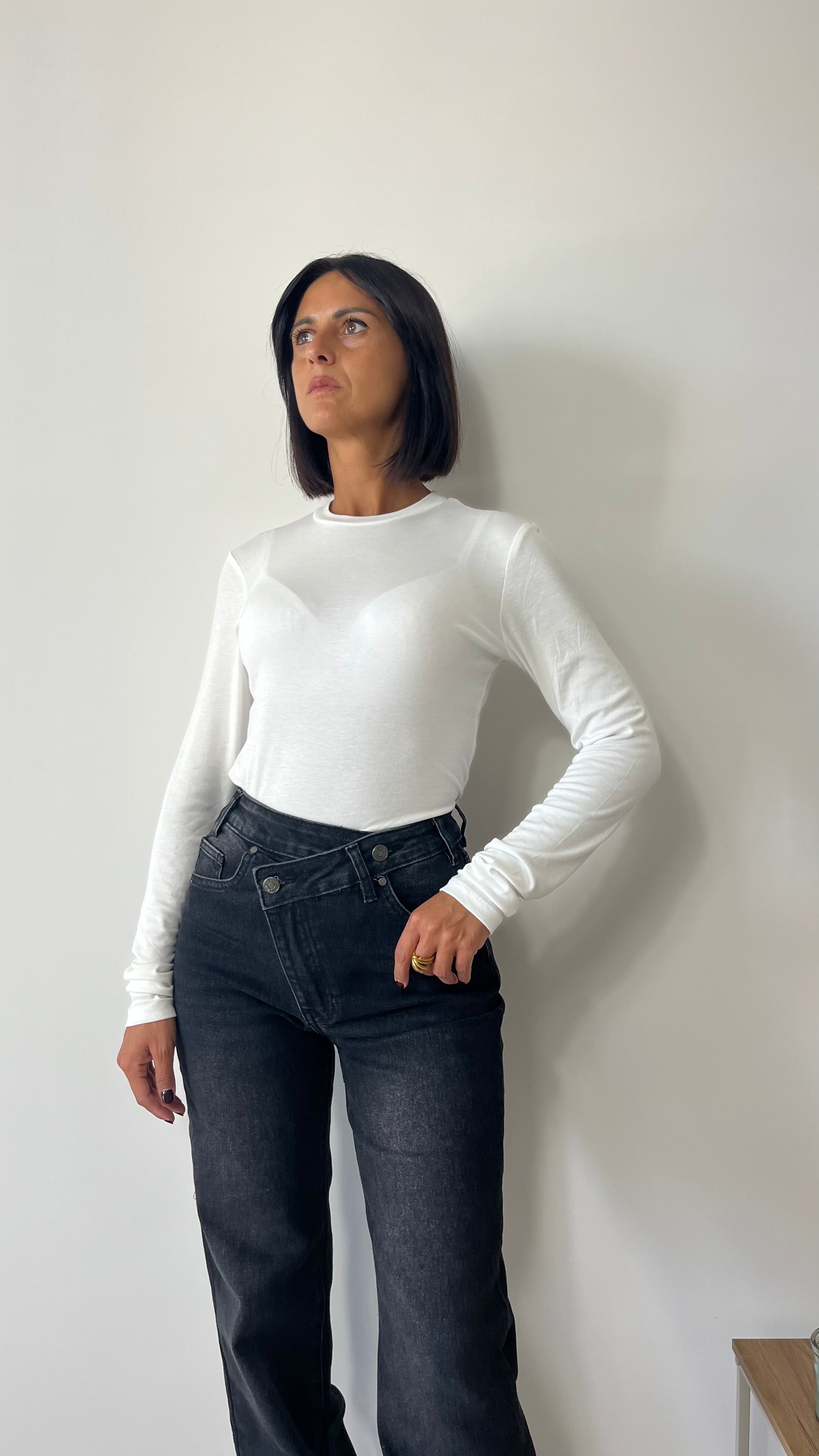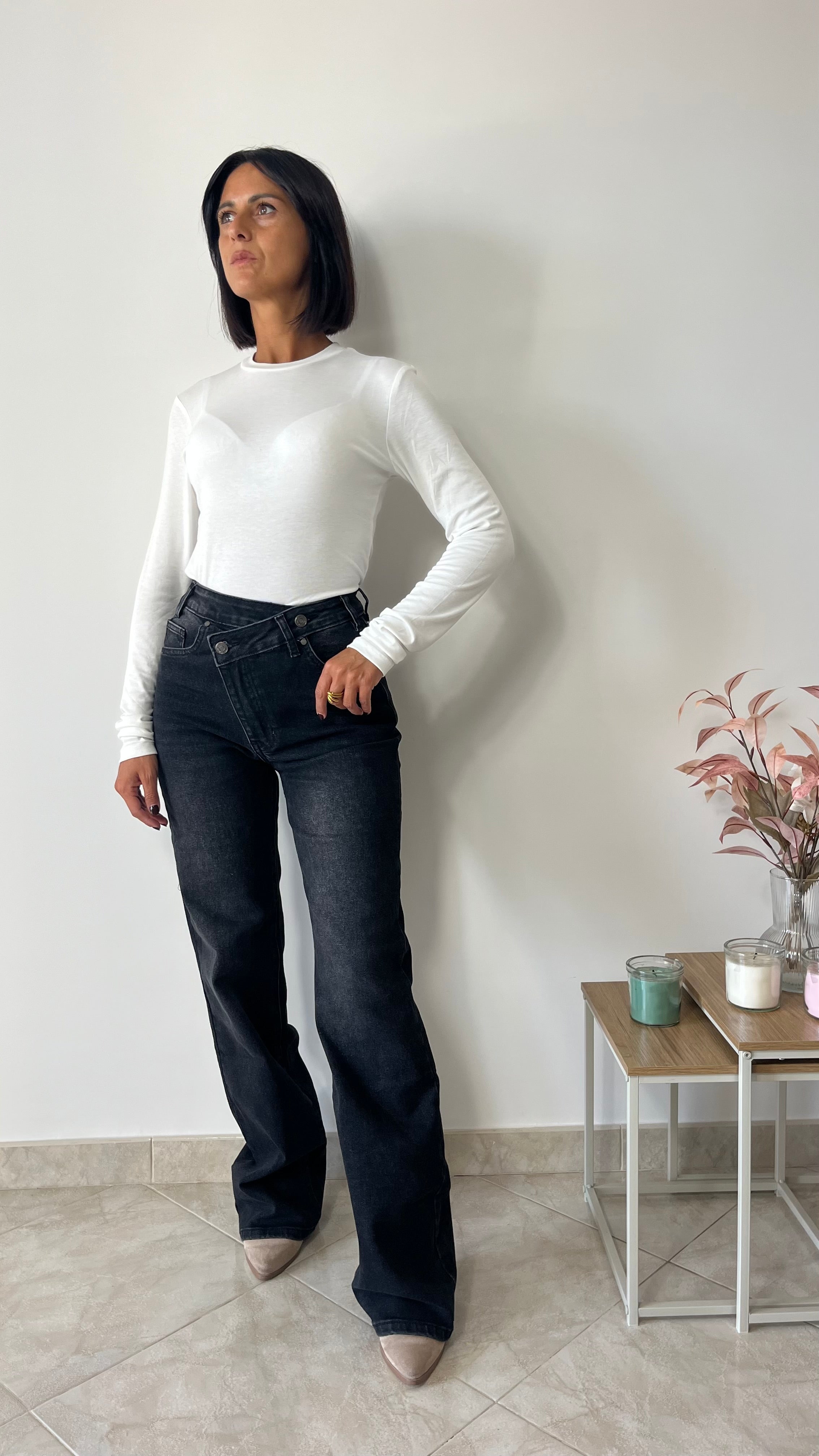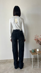 Jeans modello gamba dritta, con bottone trasversale, vita alta ed elasticizzato.