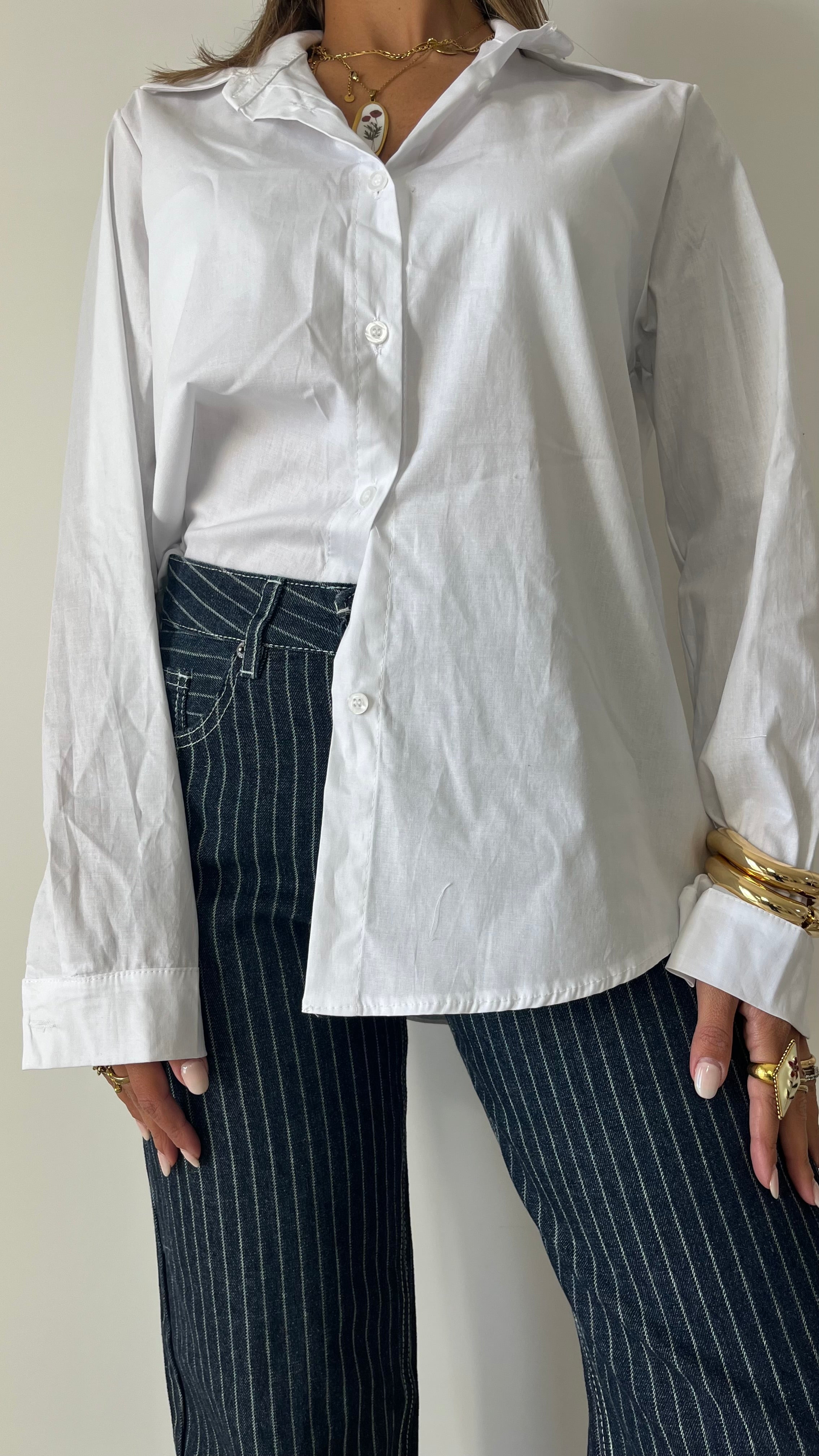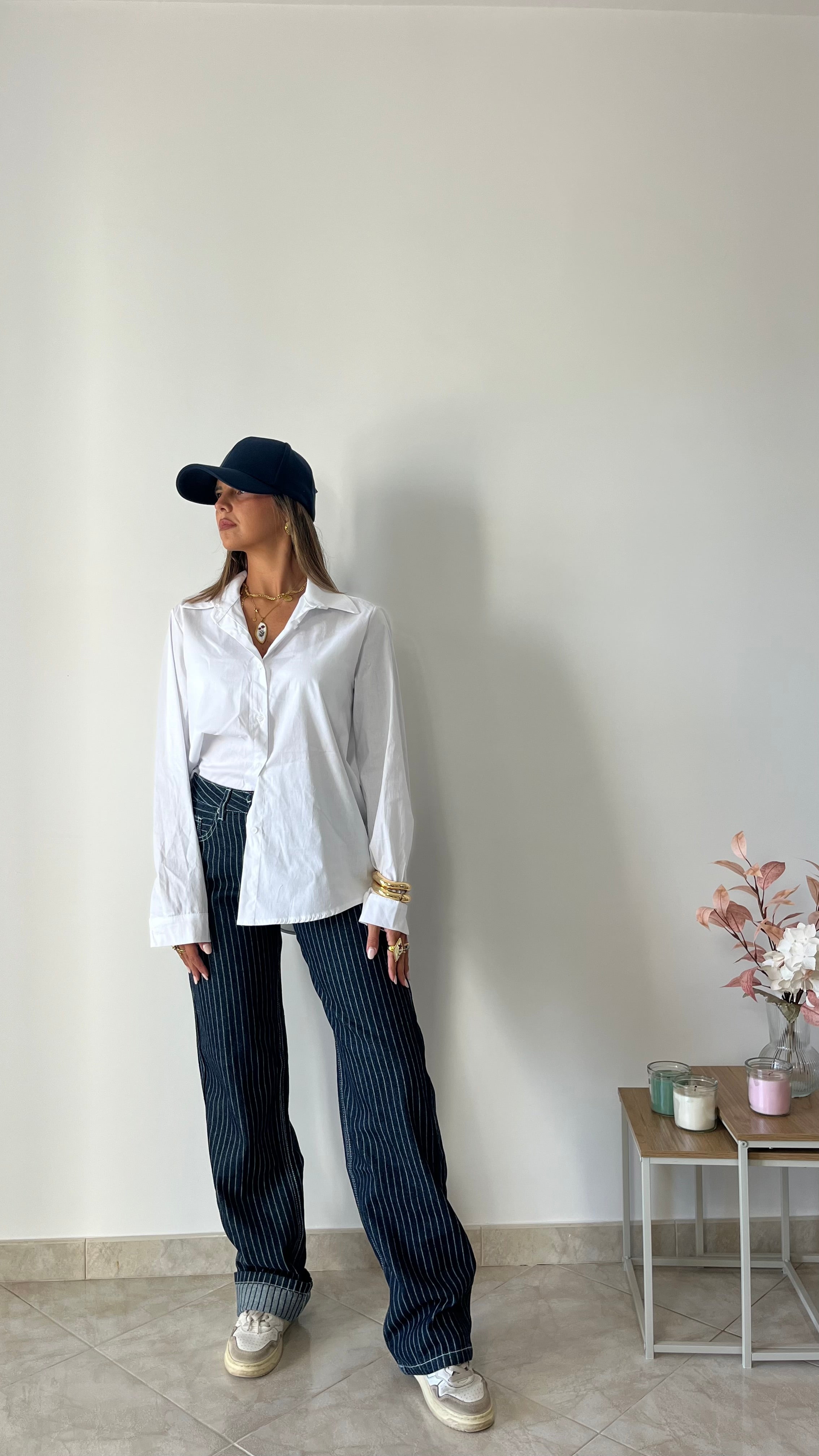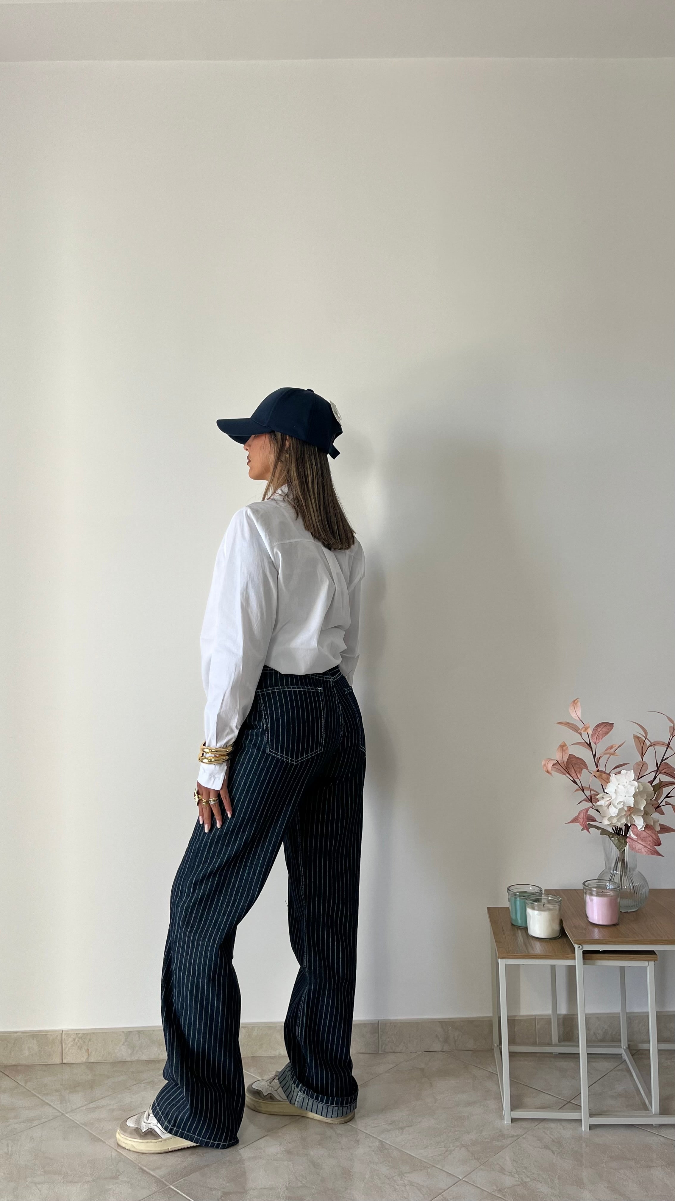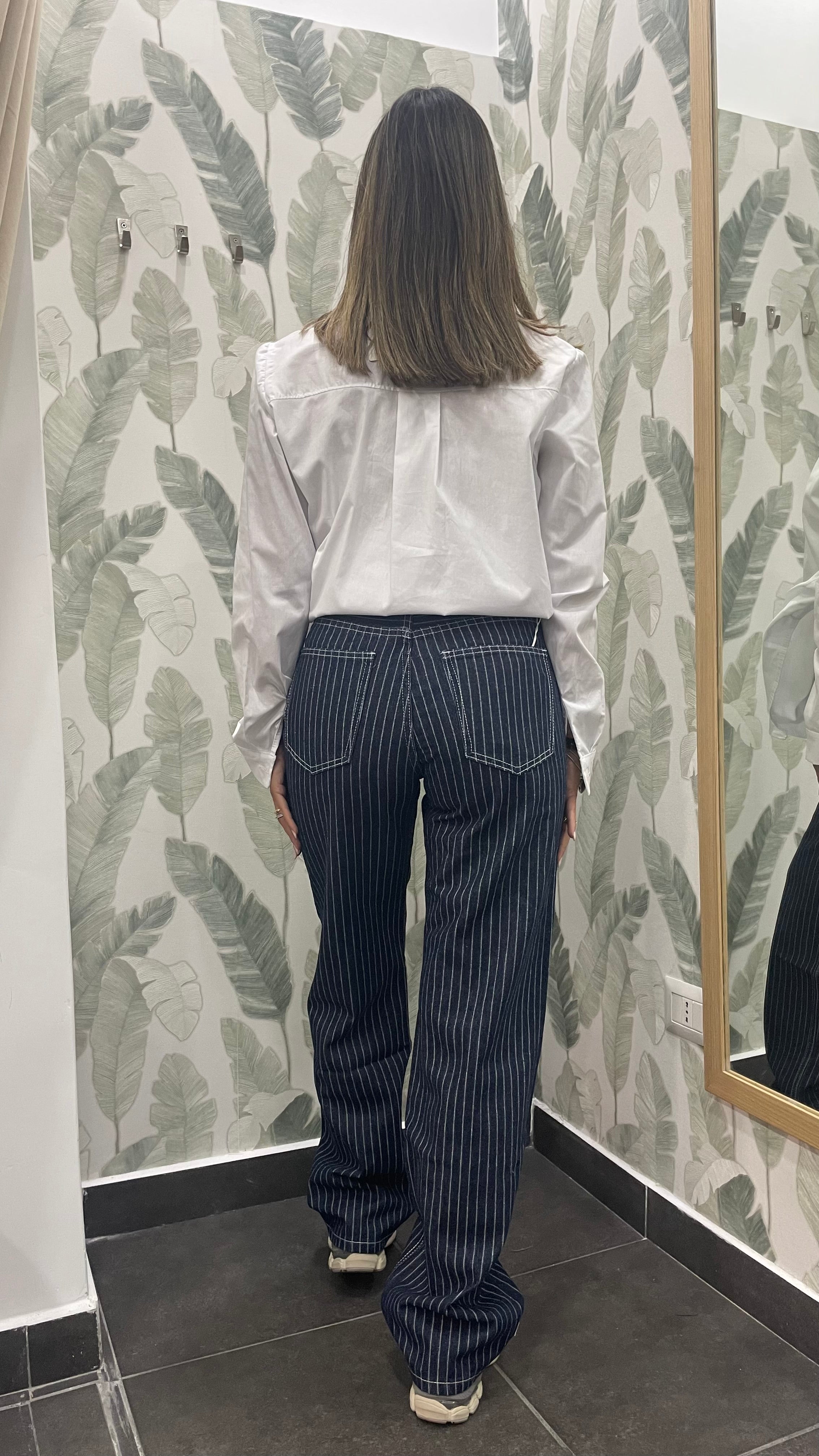 Il nuovo jeans gessato è un modello gamba dritta.
