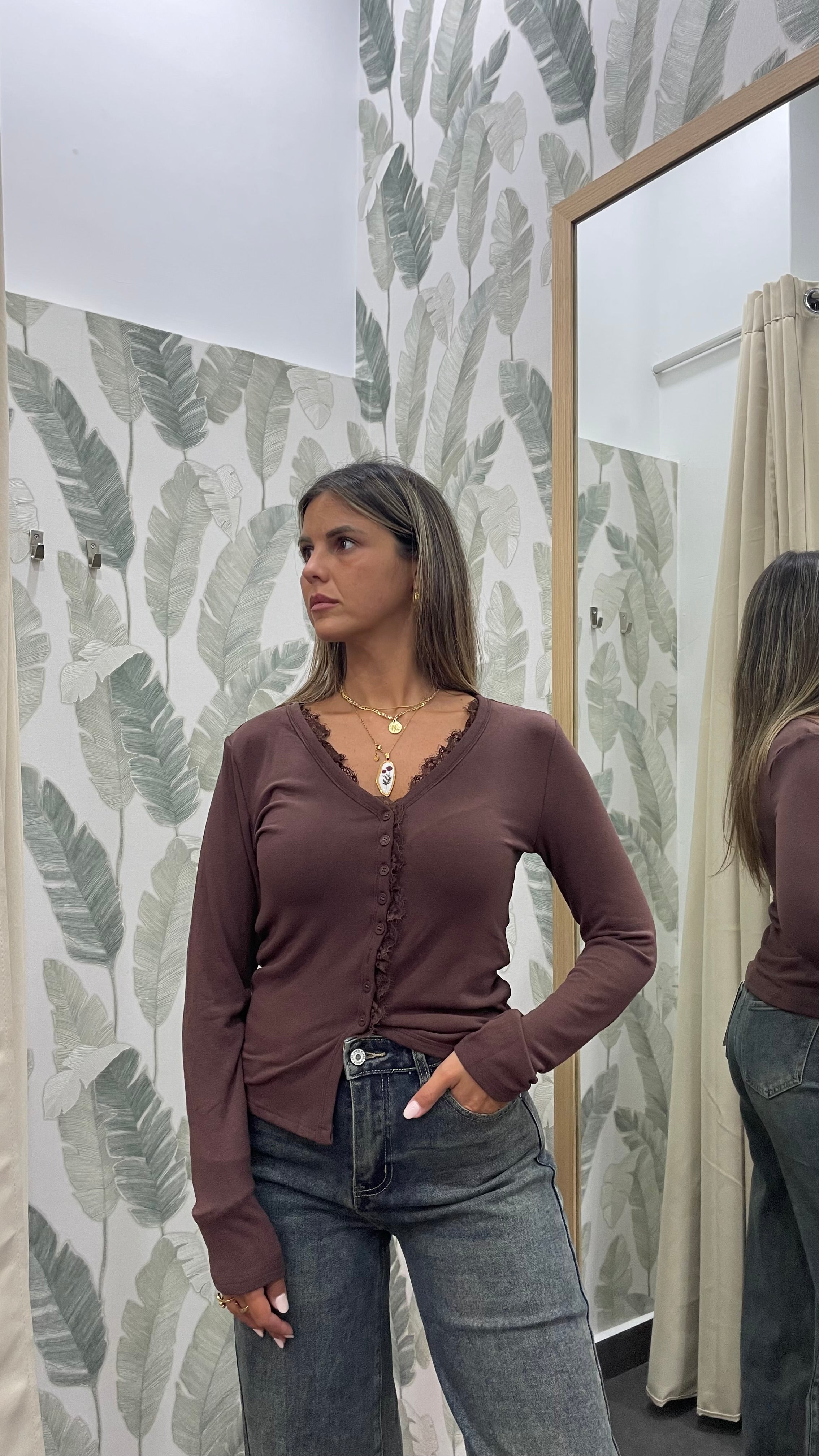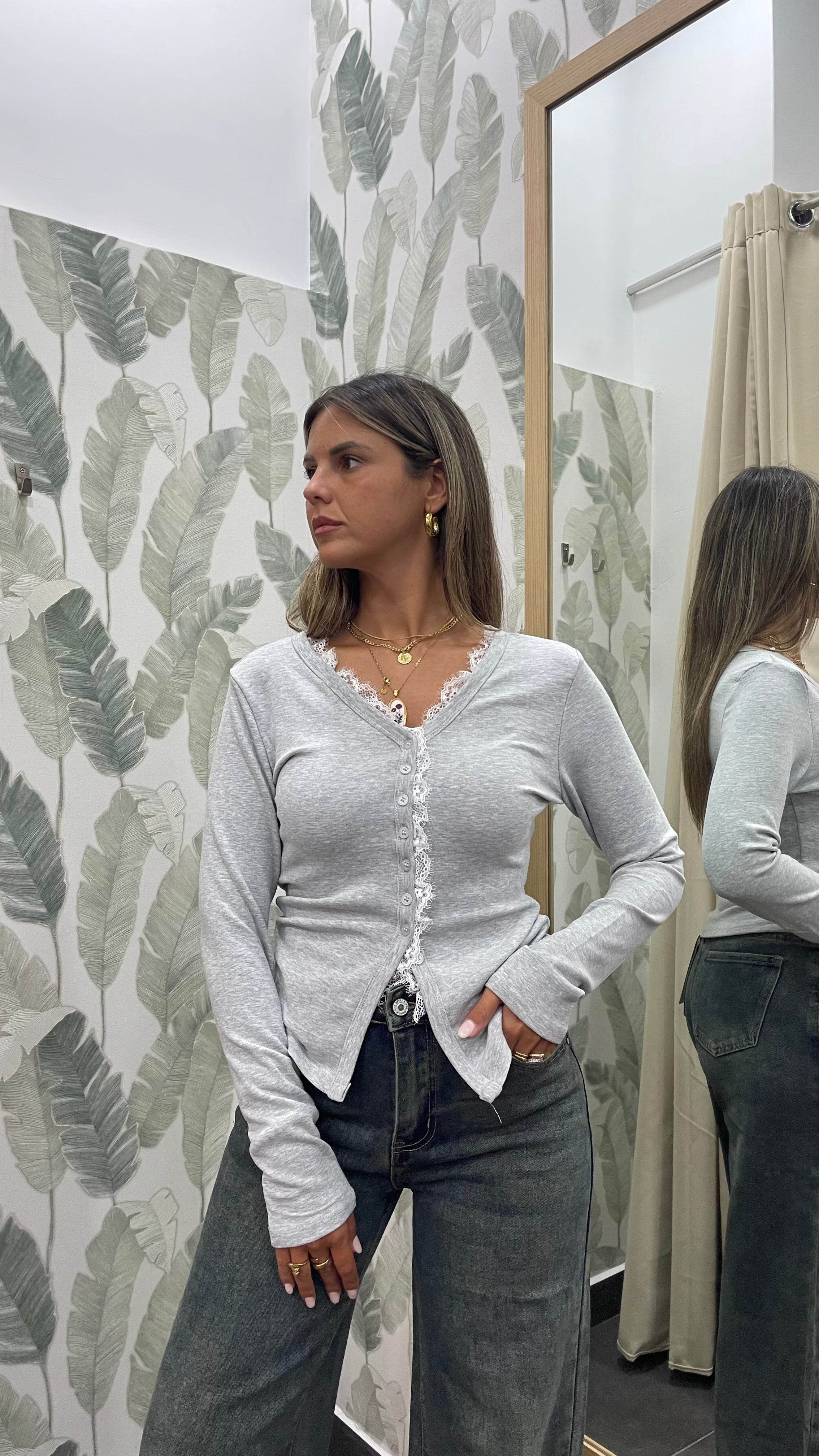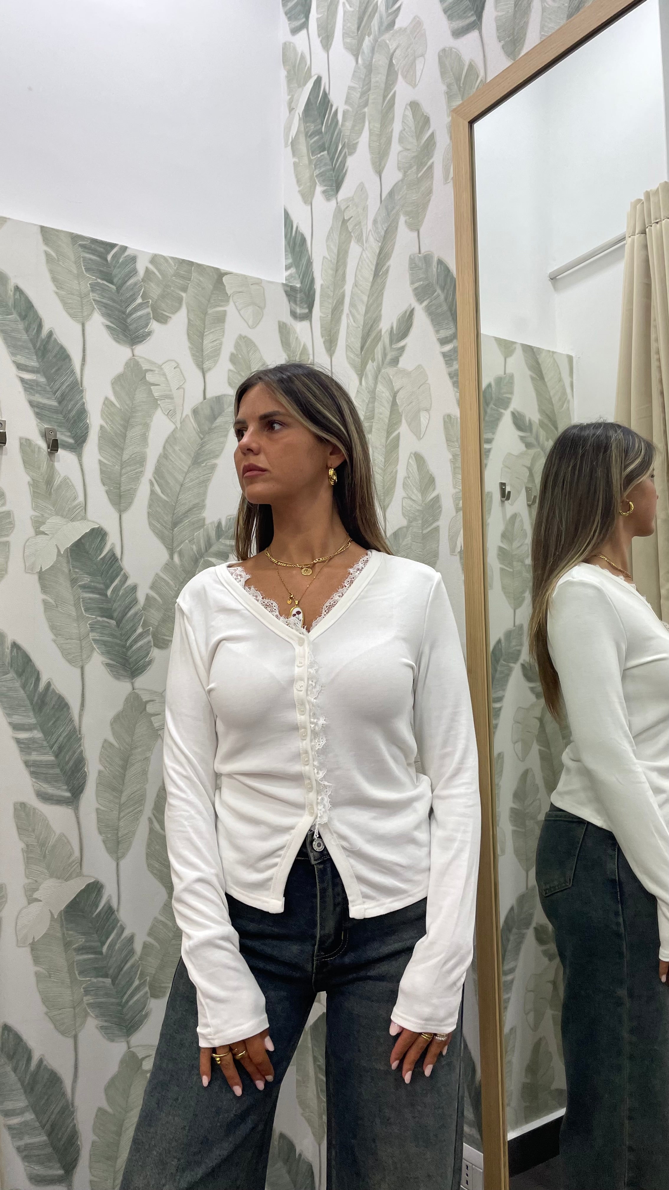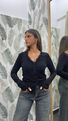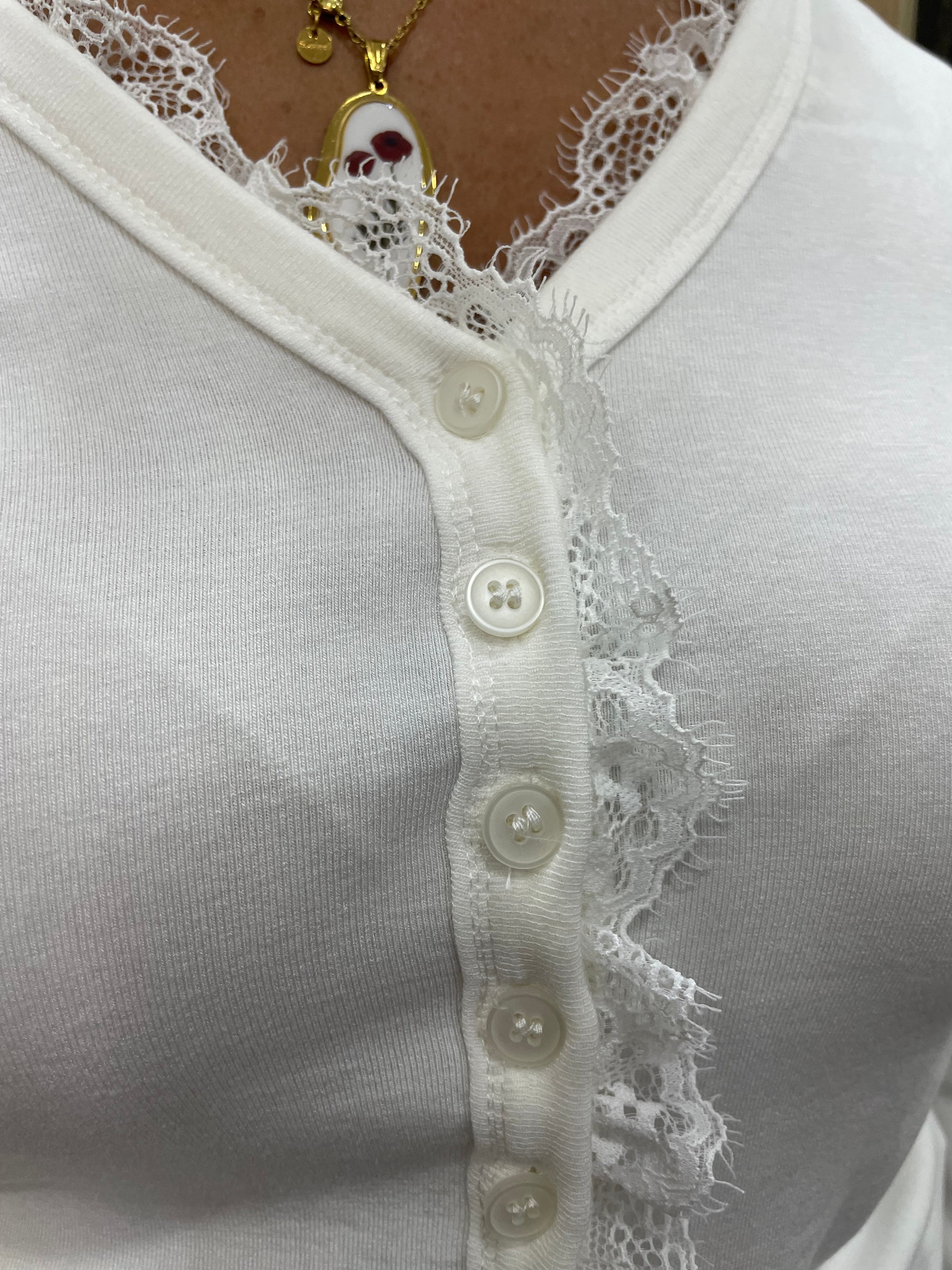 Maglia con dettaglio del pizzo sulla scollatura e lungo la bordatura dei bottoncini ( veri).