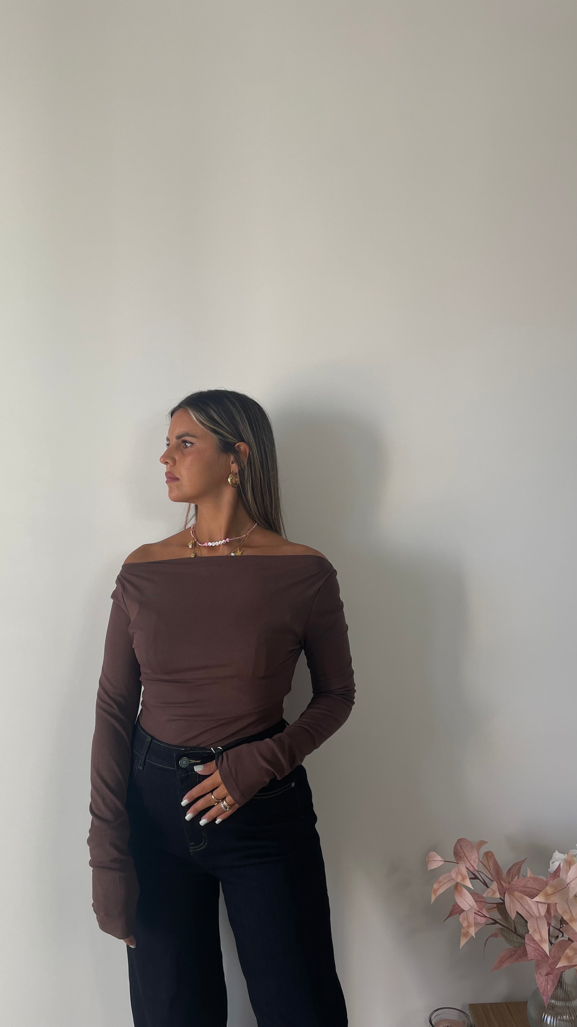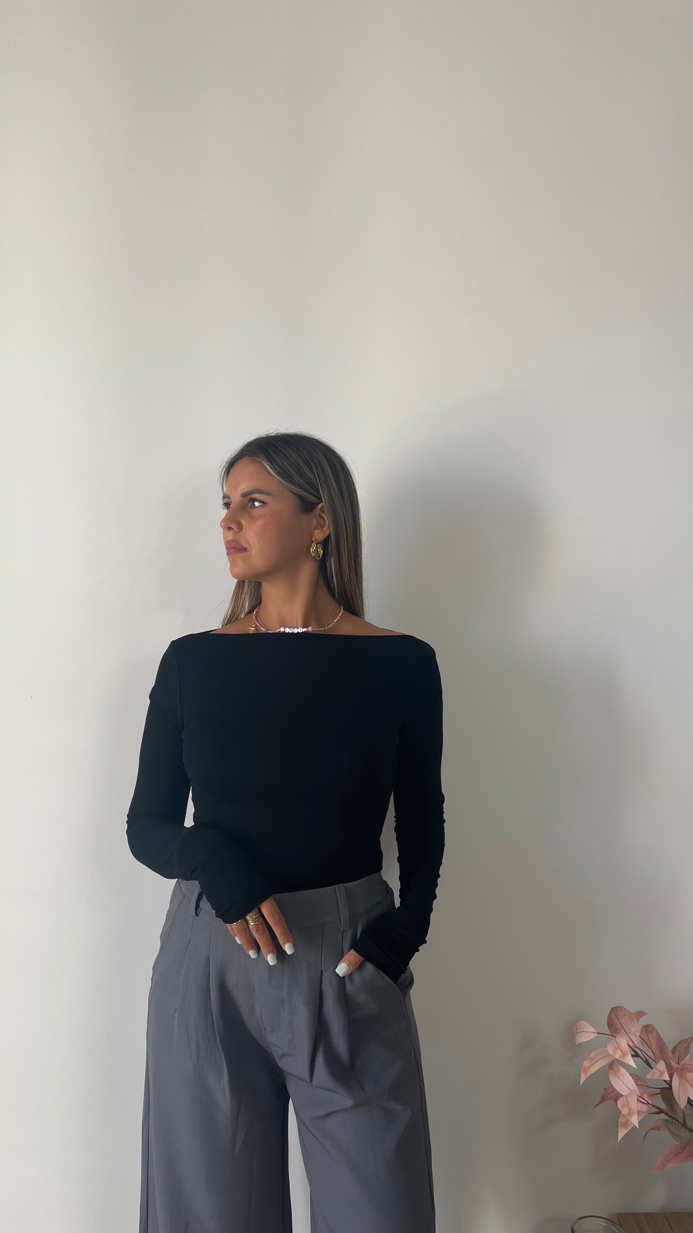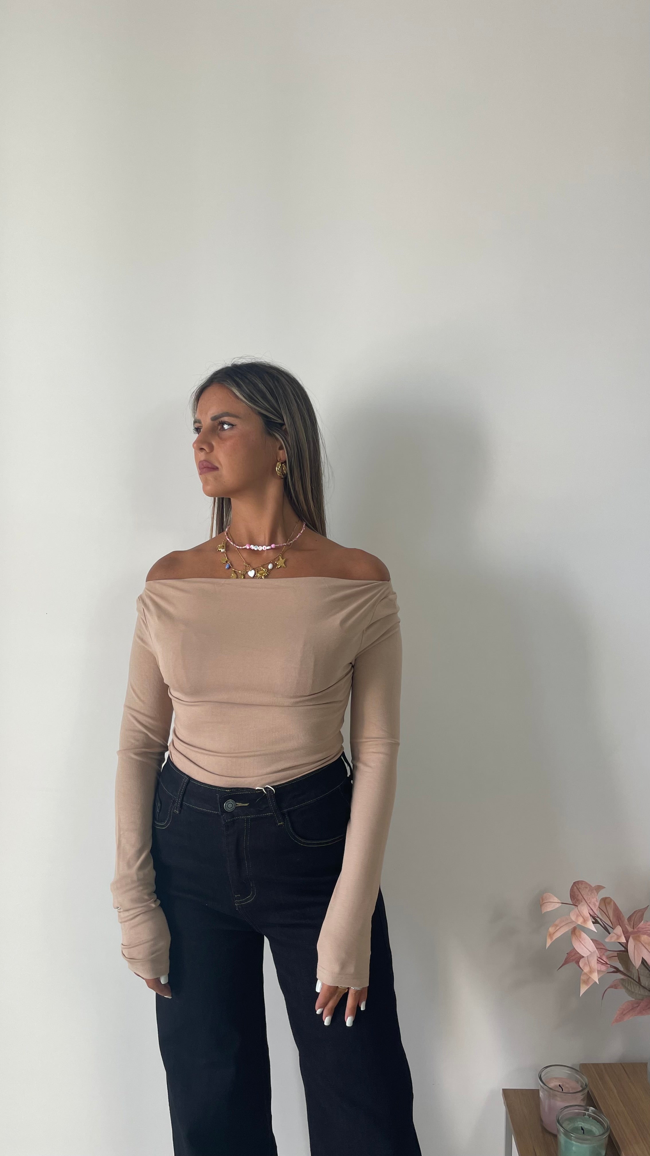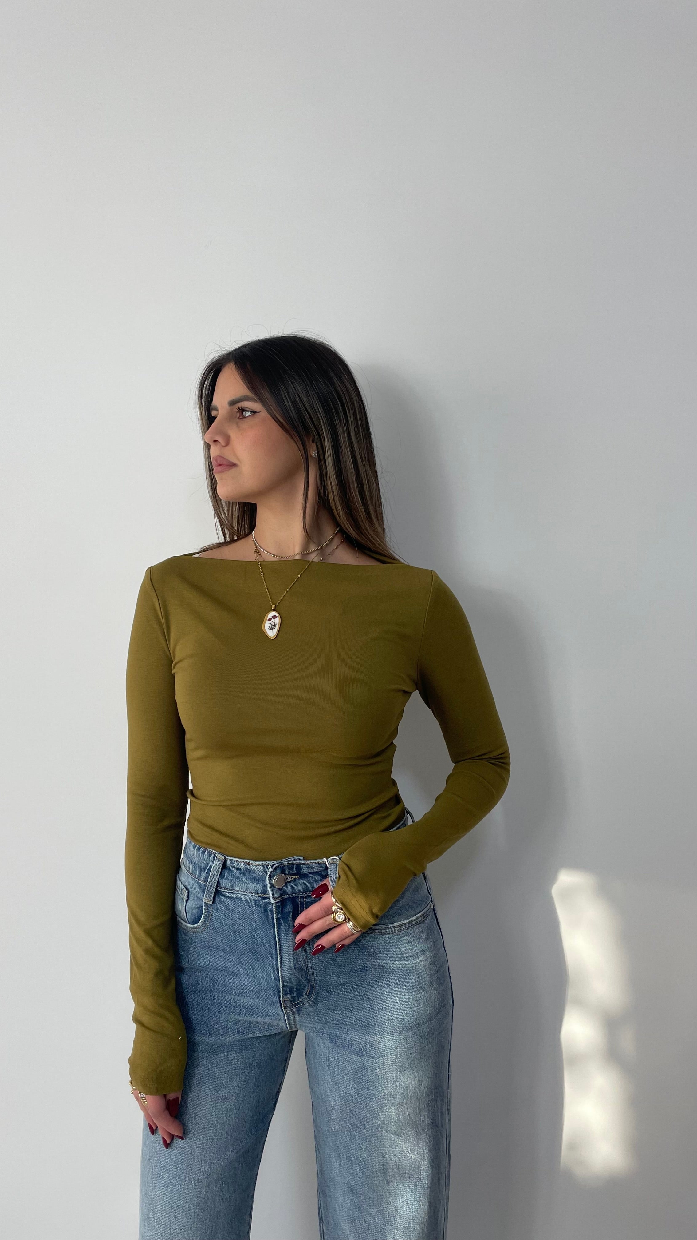 Maglia basic manica lunga con scollo a barca, tessuto elasticizzato taglia unica