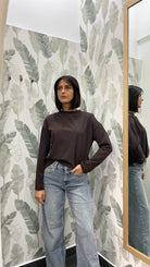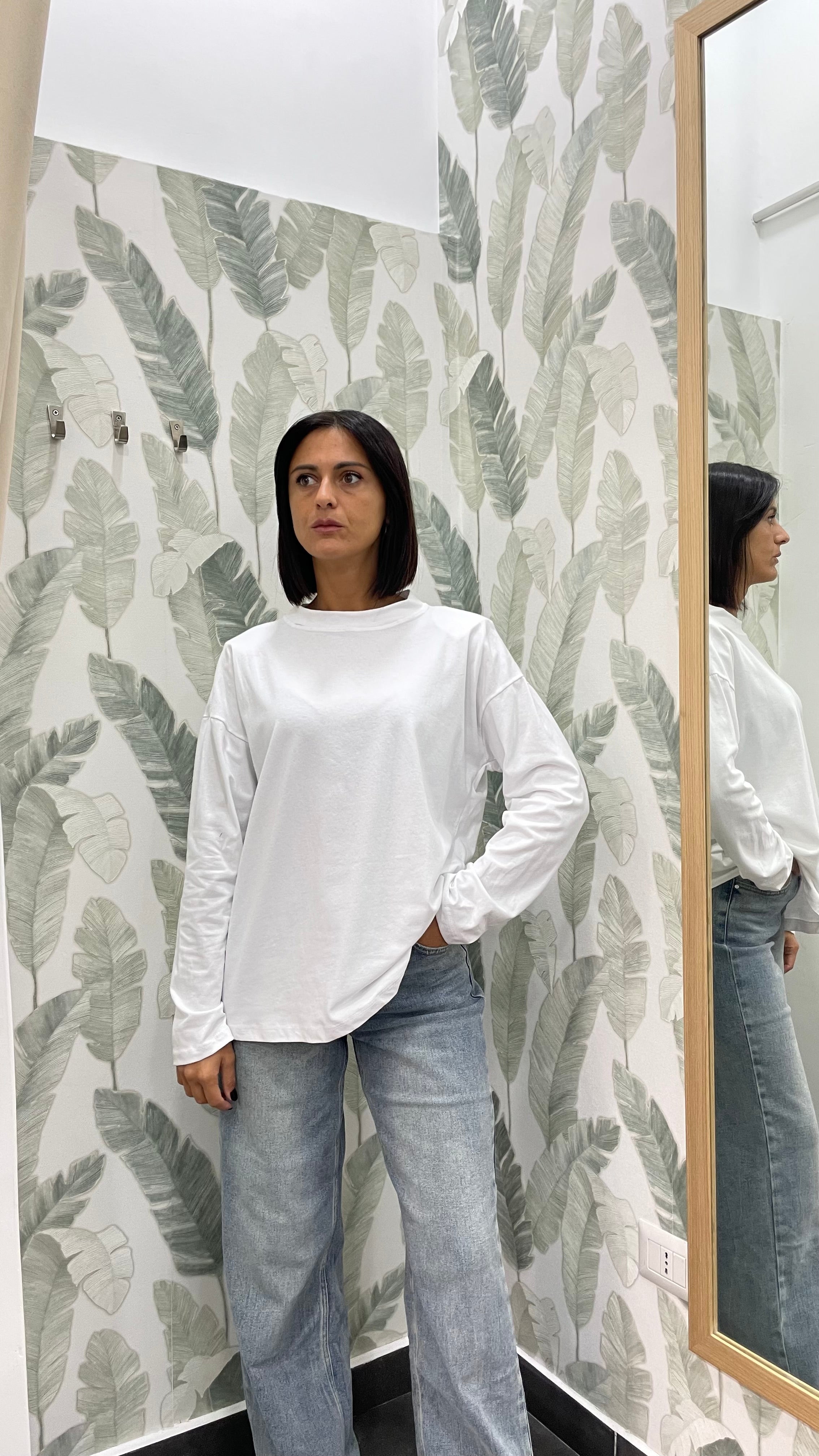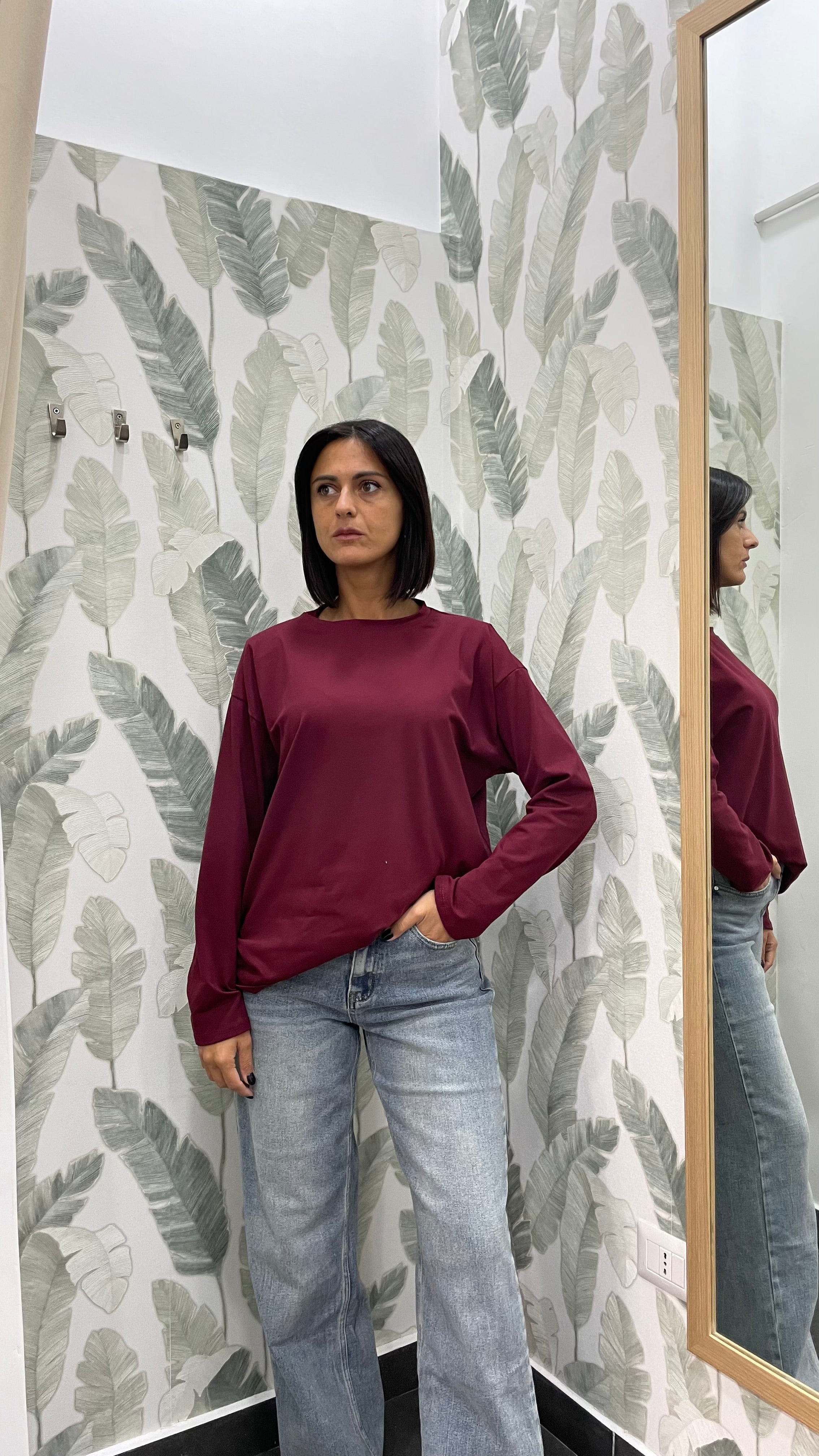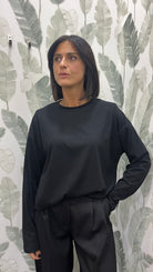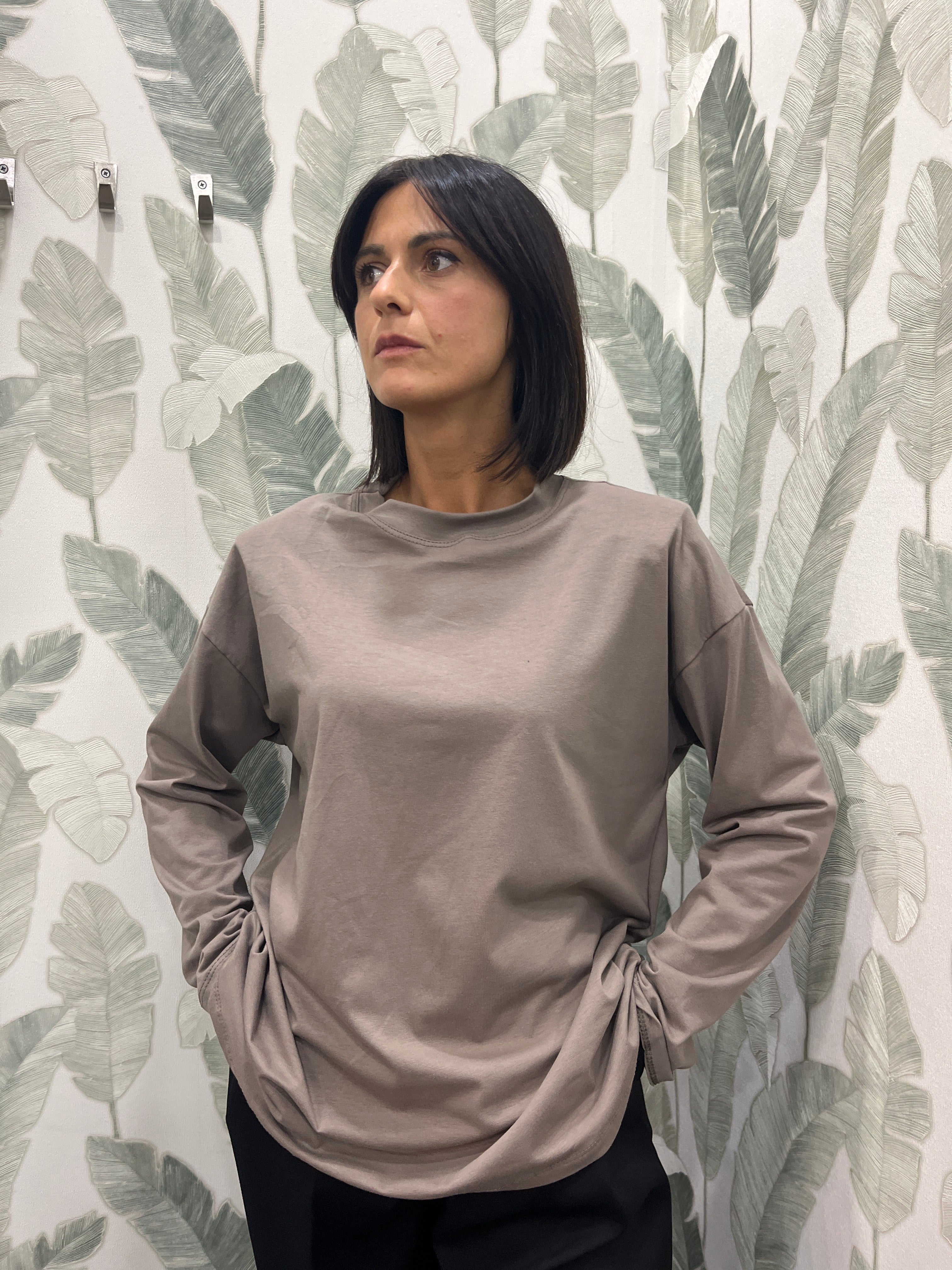 Modello comodo e largo, girocollo e spalline imbottite.