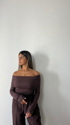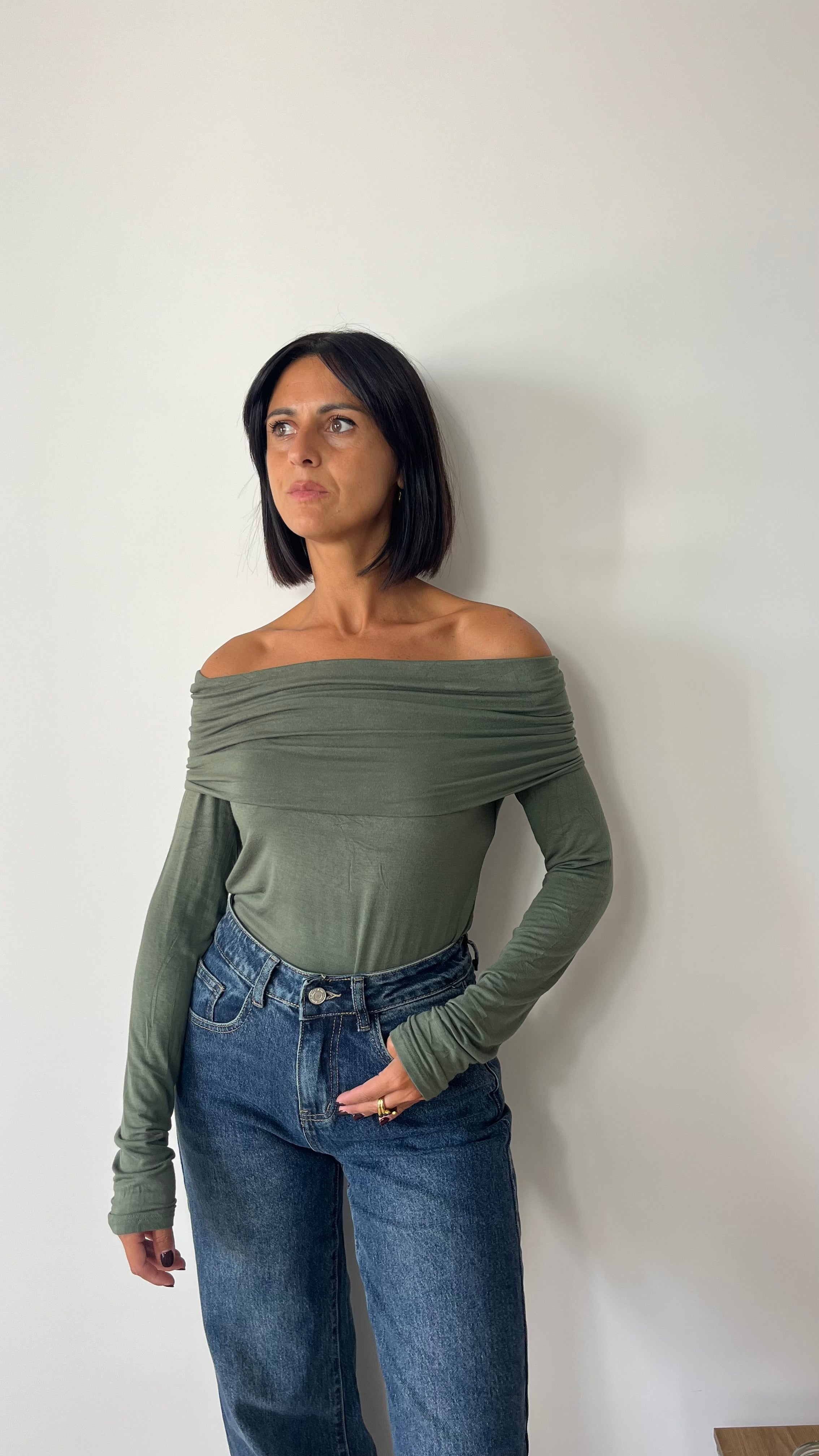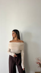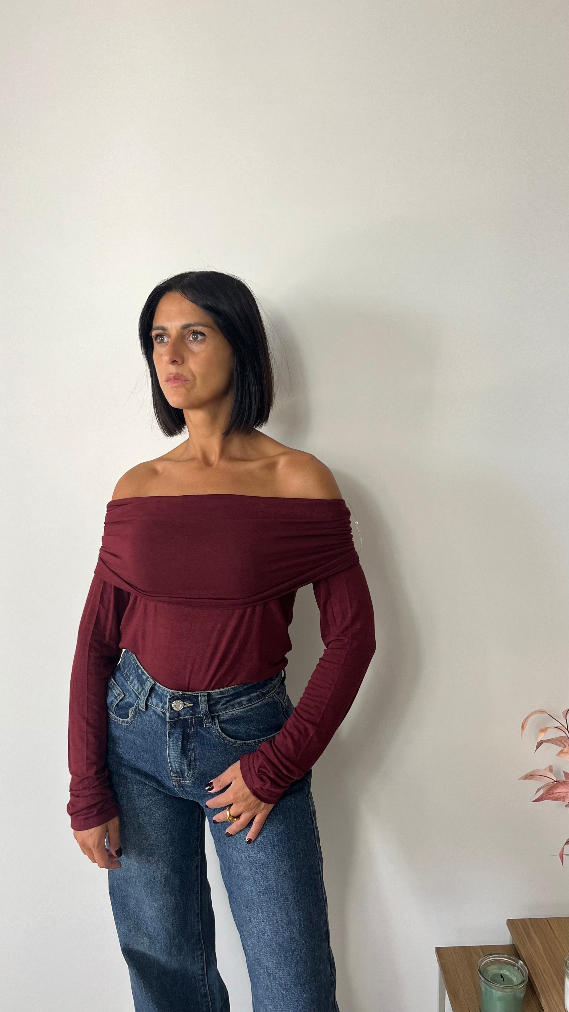 La maglia Isabella ha lo scollo a barca ed è in un tessuto morbido ed elasticizzato.