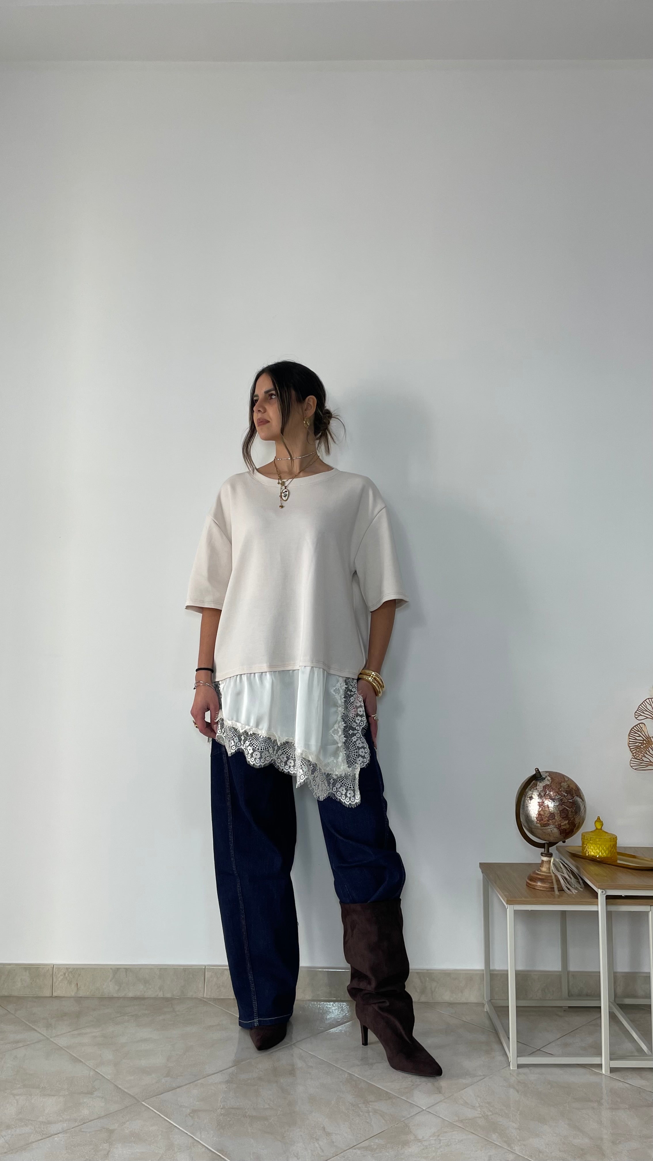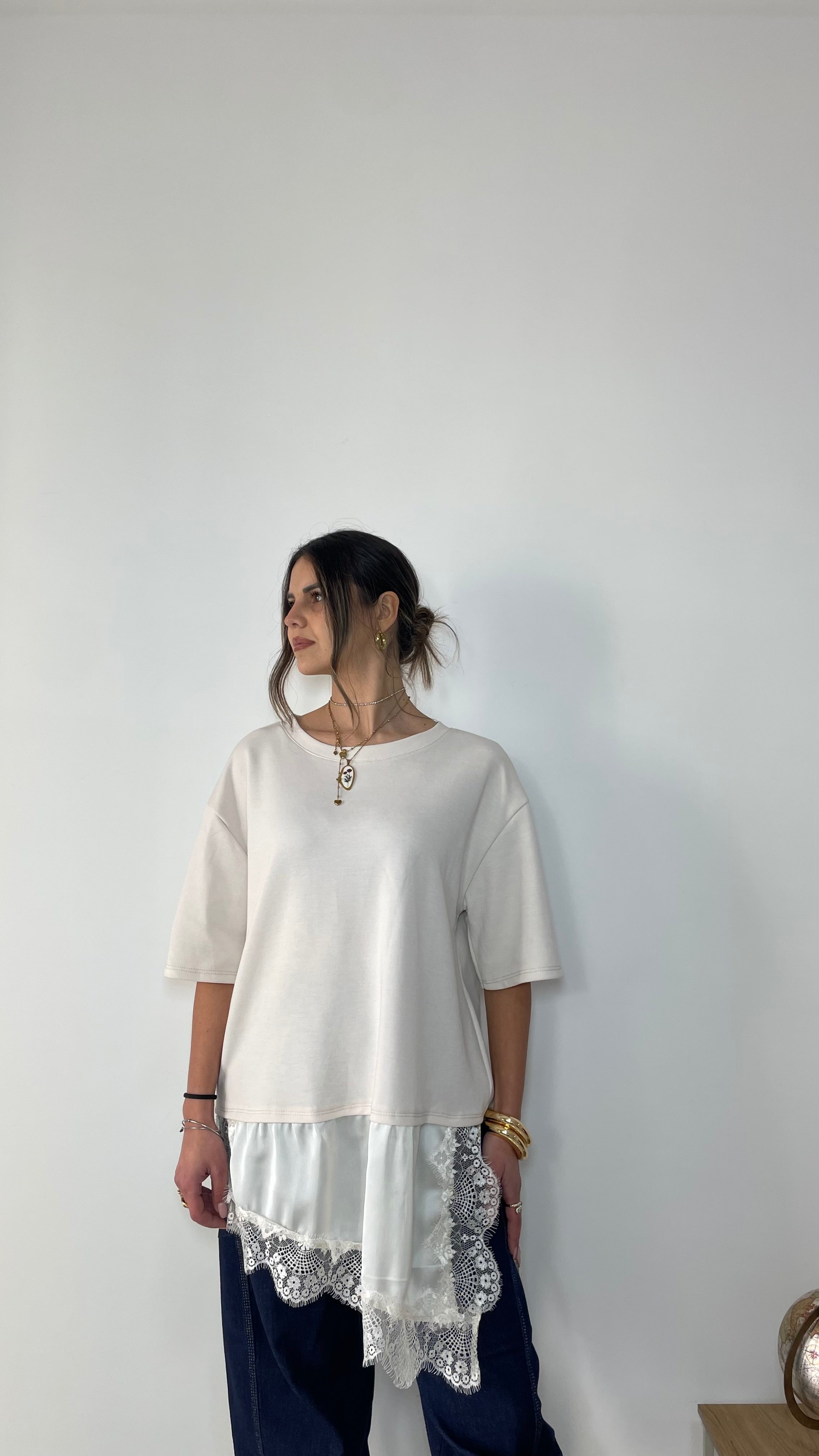 La maglia ha una linea pulita, contemporanea ed è una tg unica oversize. Veste fino alla tg XL.