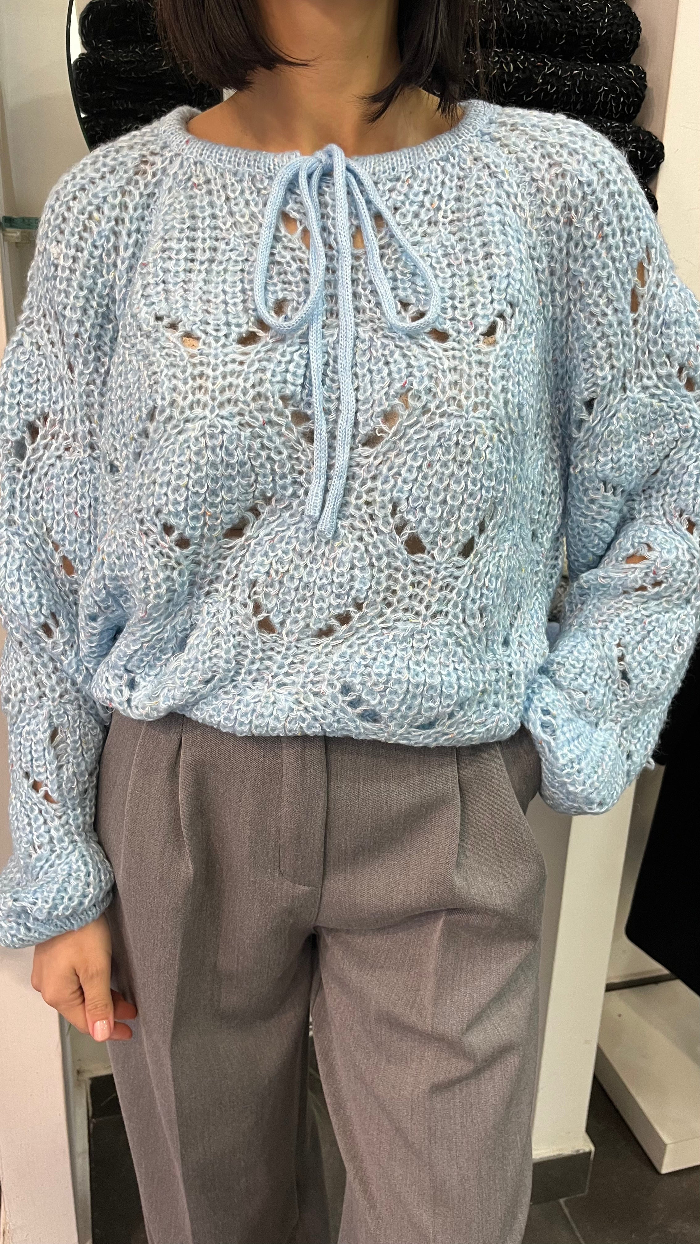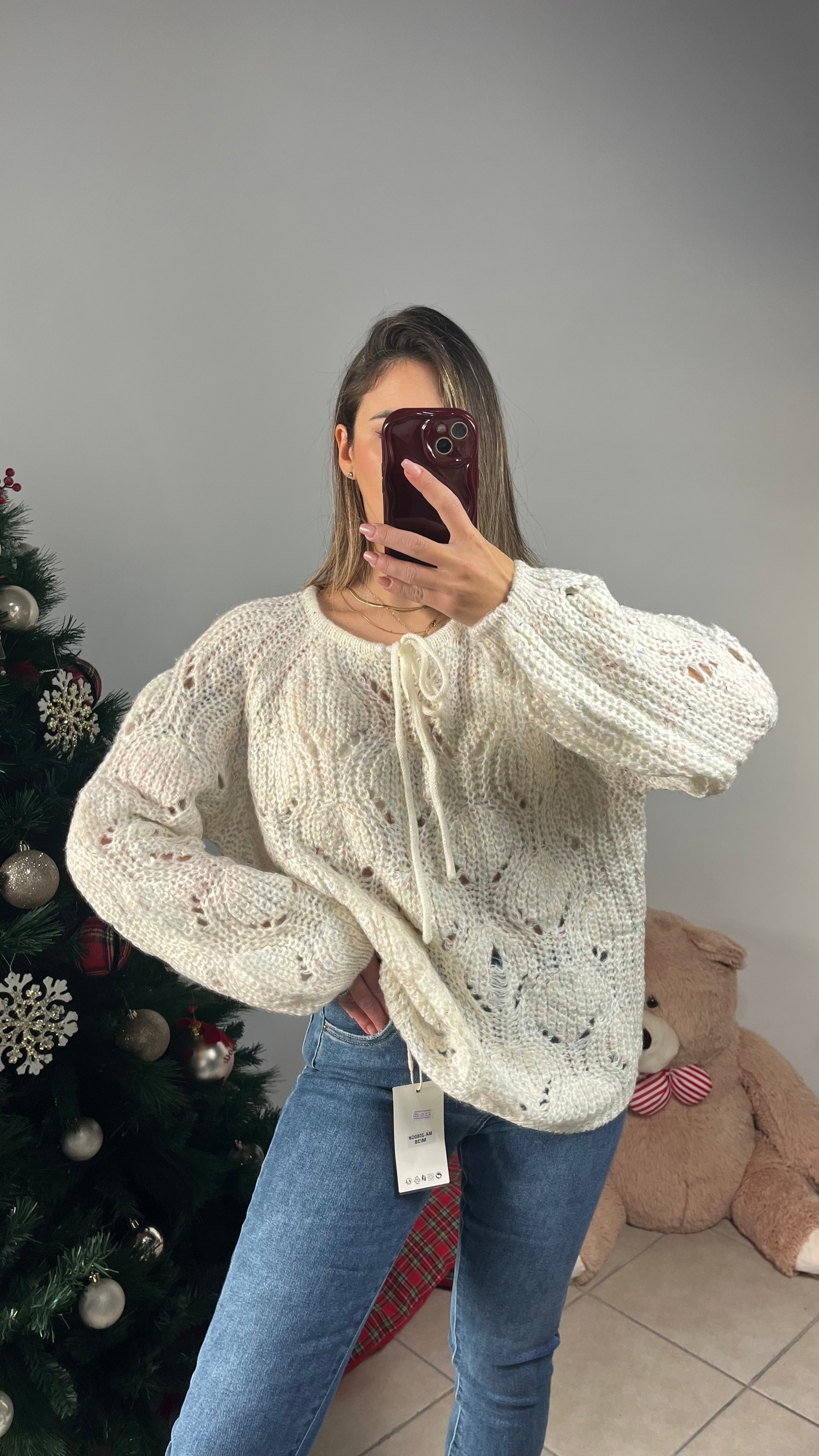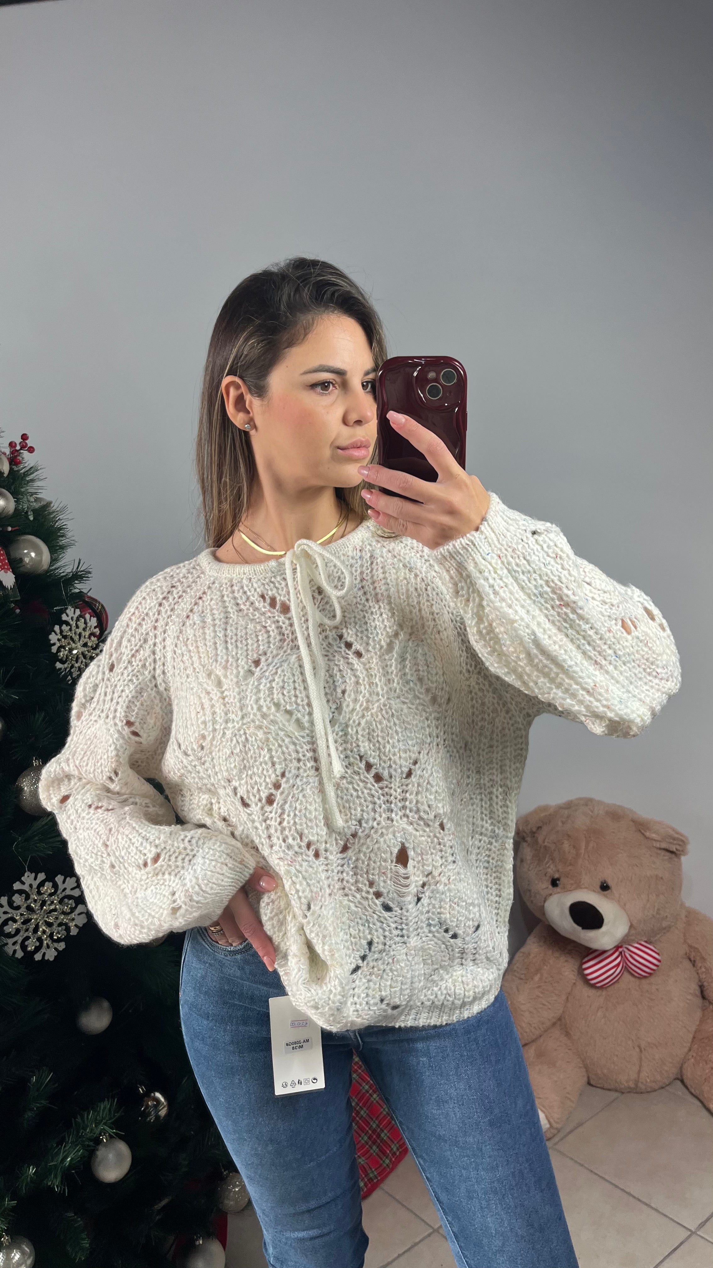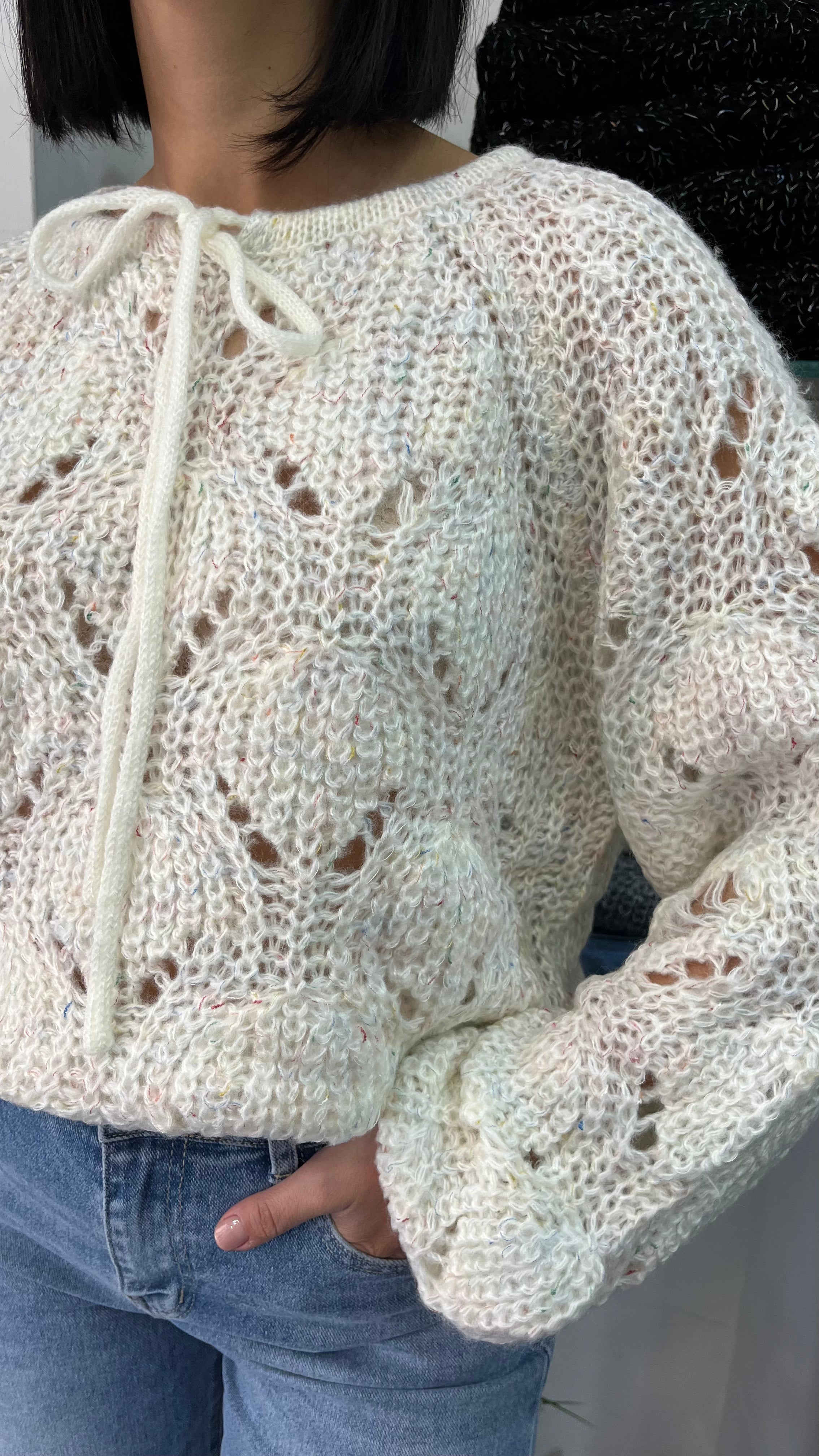 Maglione puntinato a colori, con laccio al collo, manica a palloncino