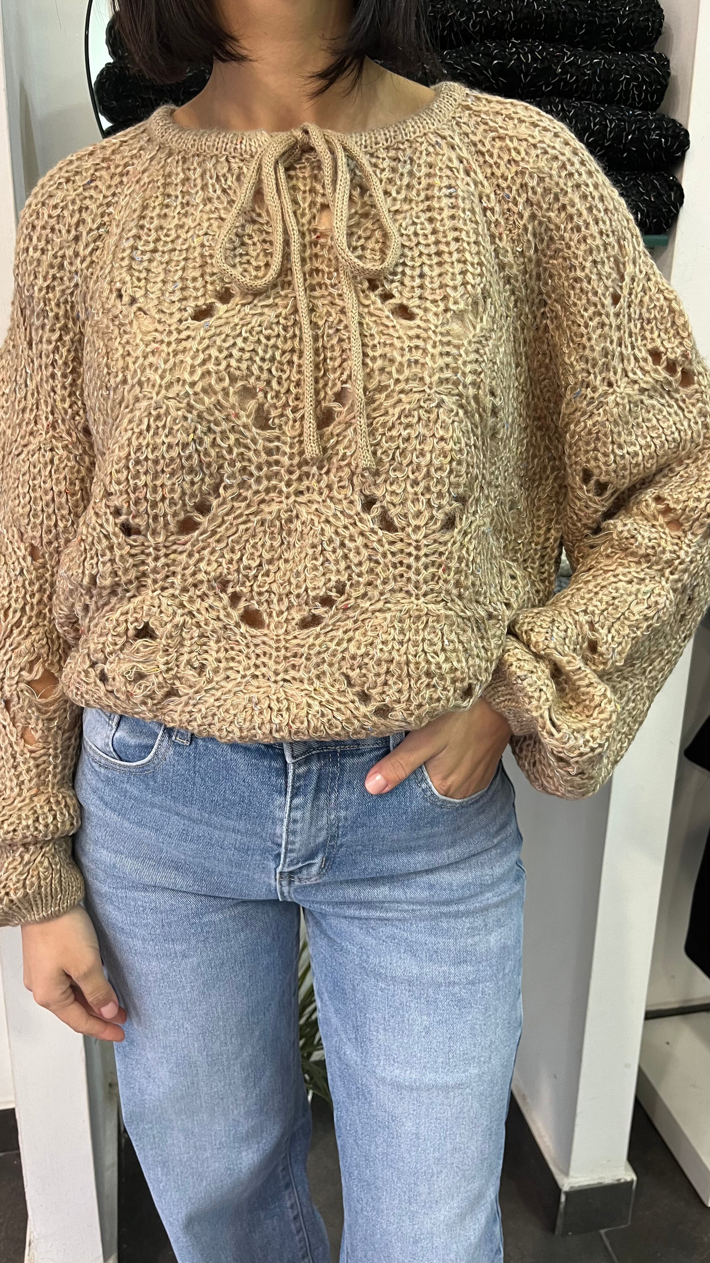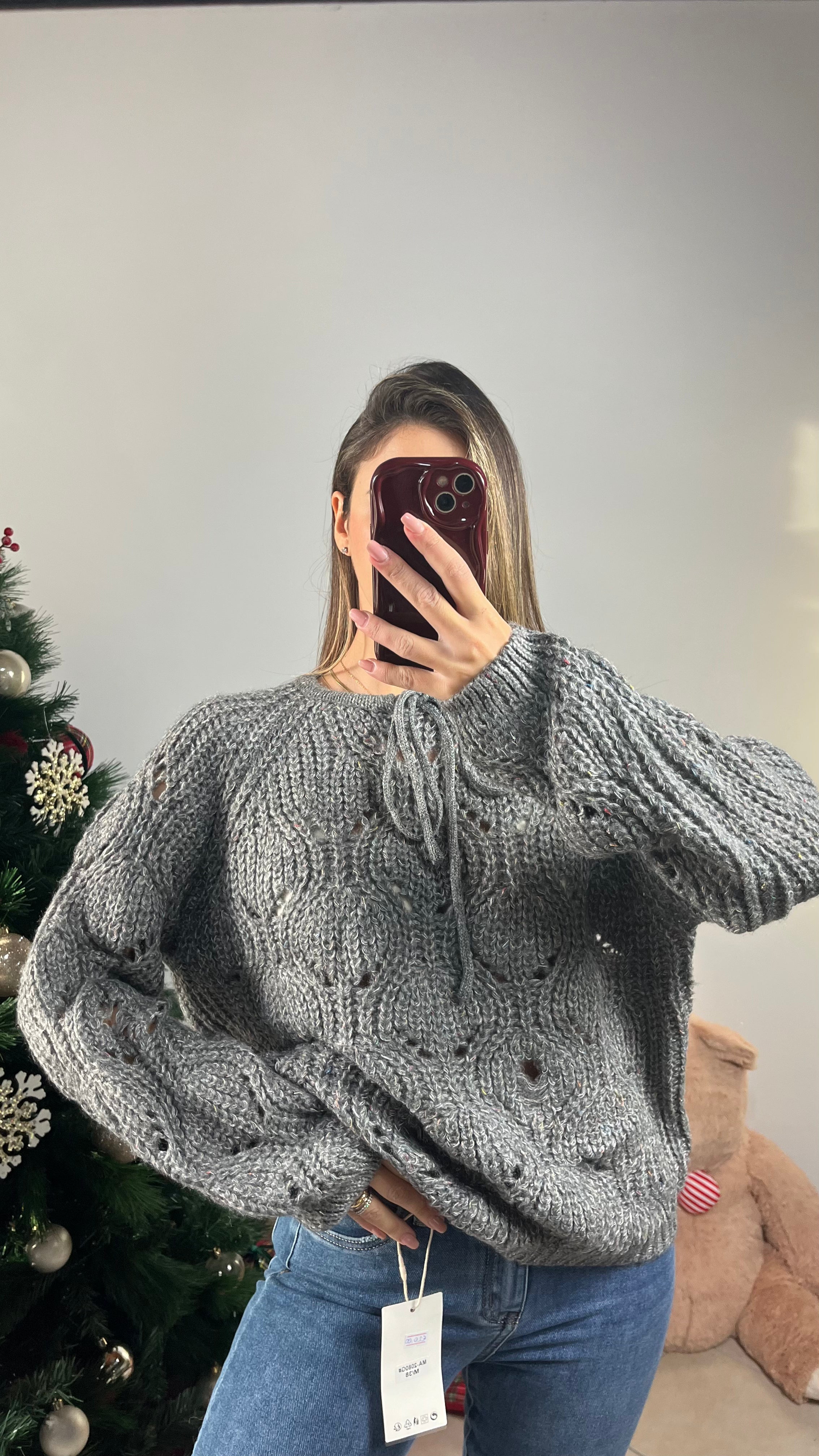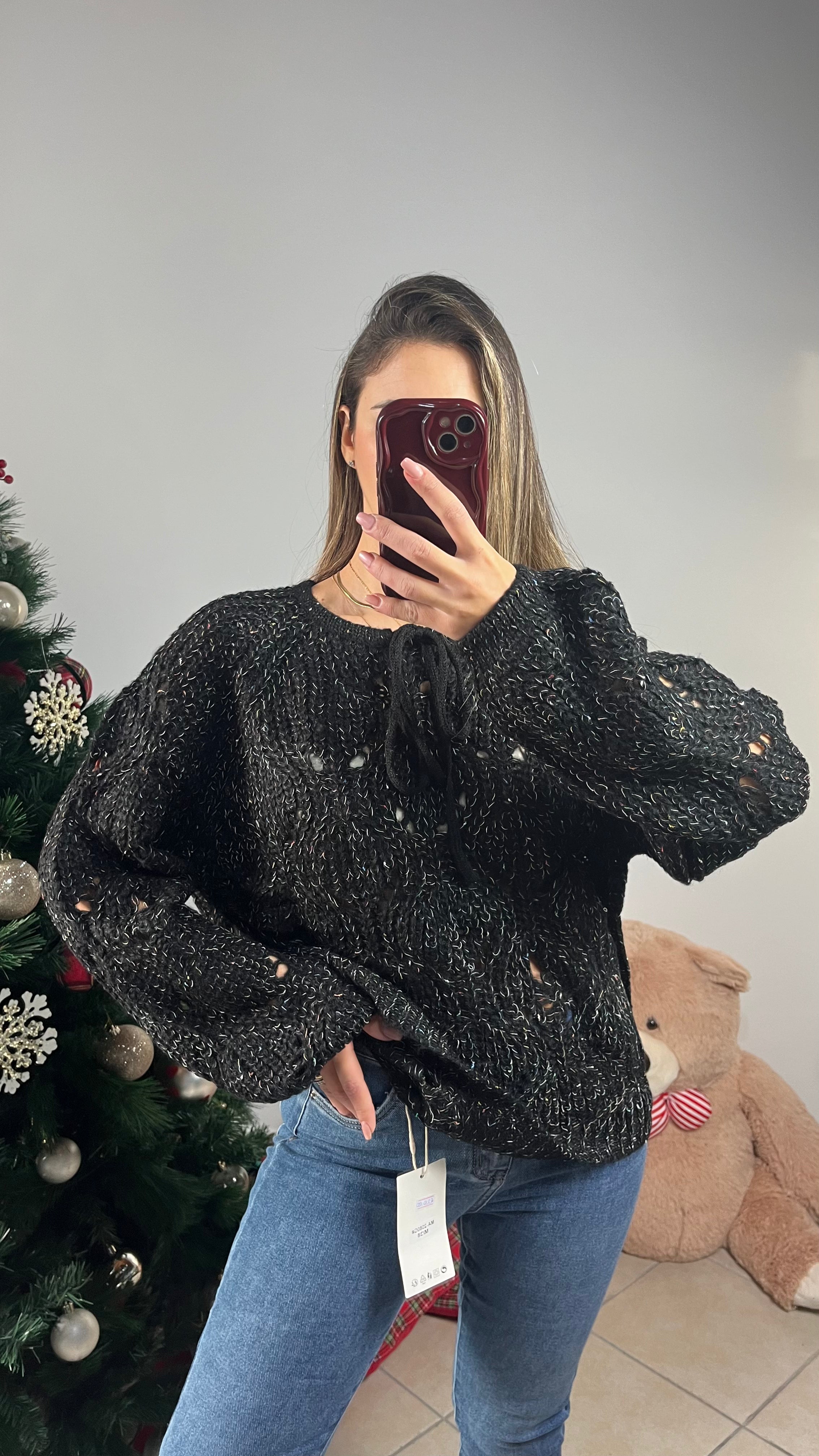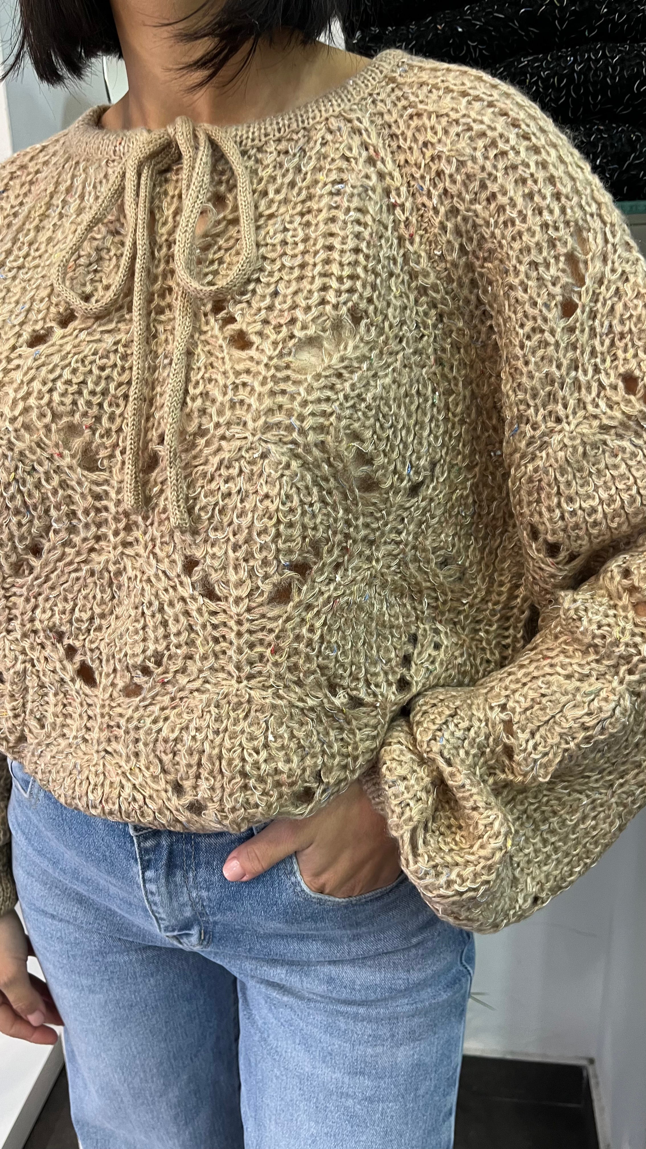 Maglione puntinato a colori, con laccio al collo, manica a palloncino