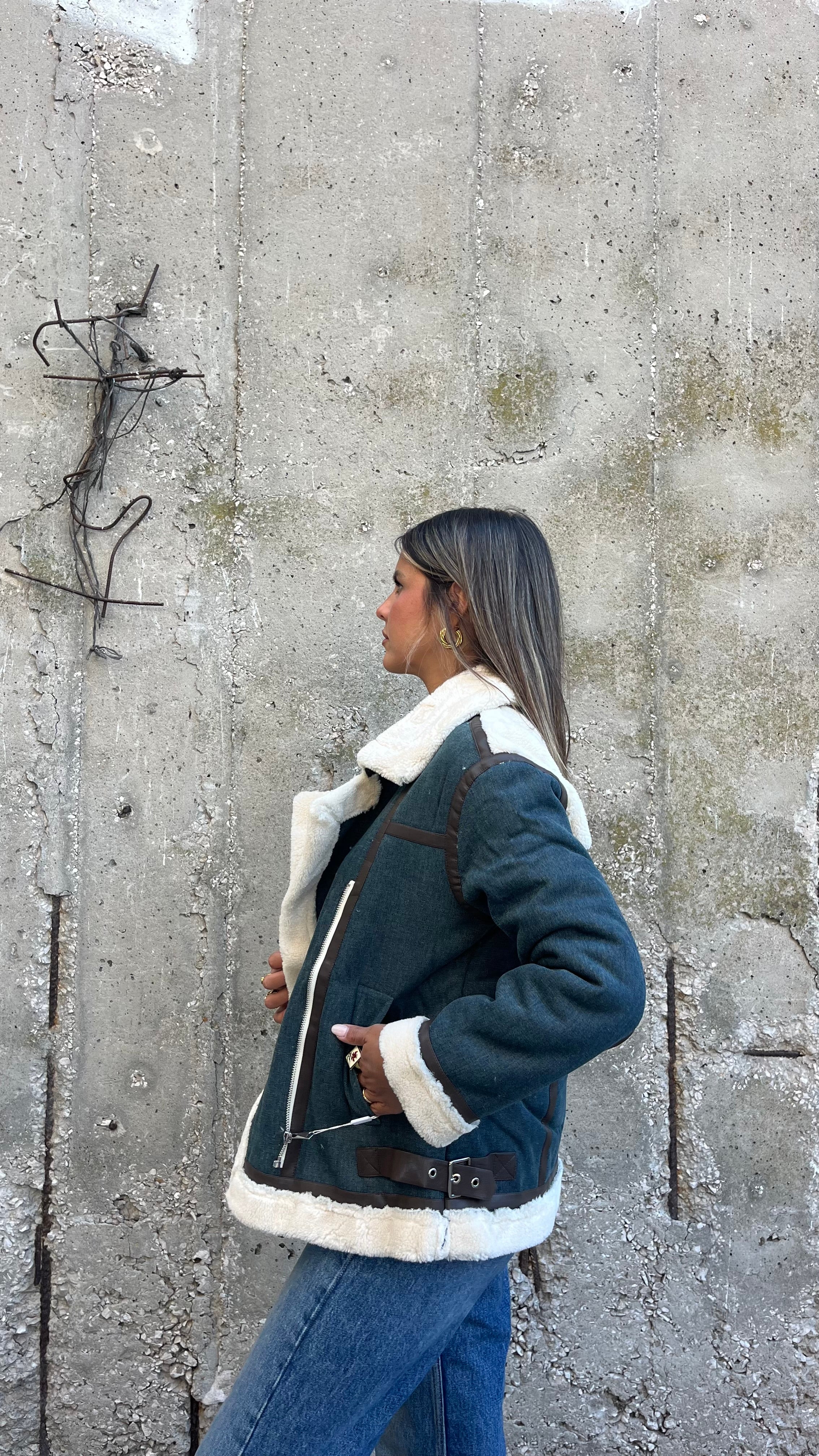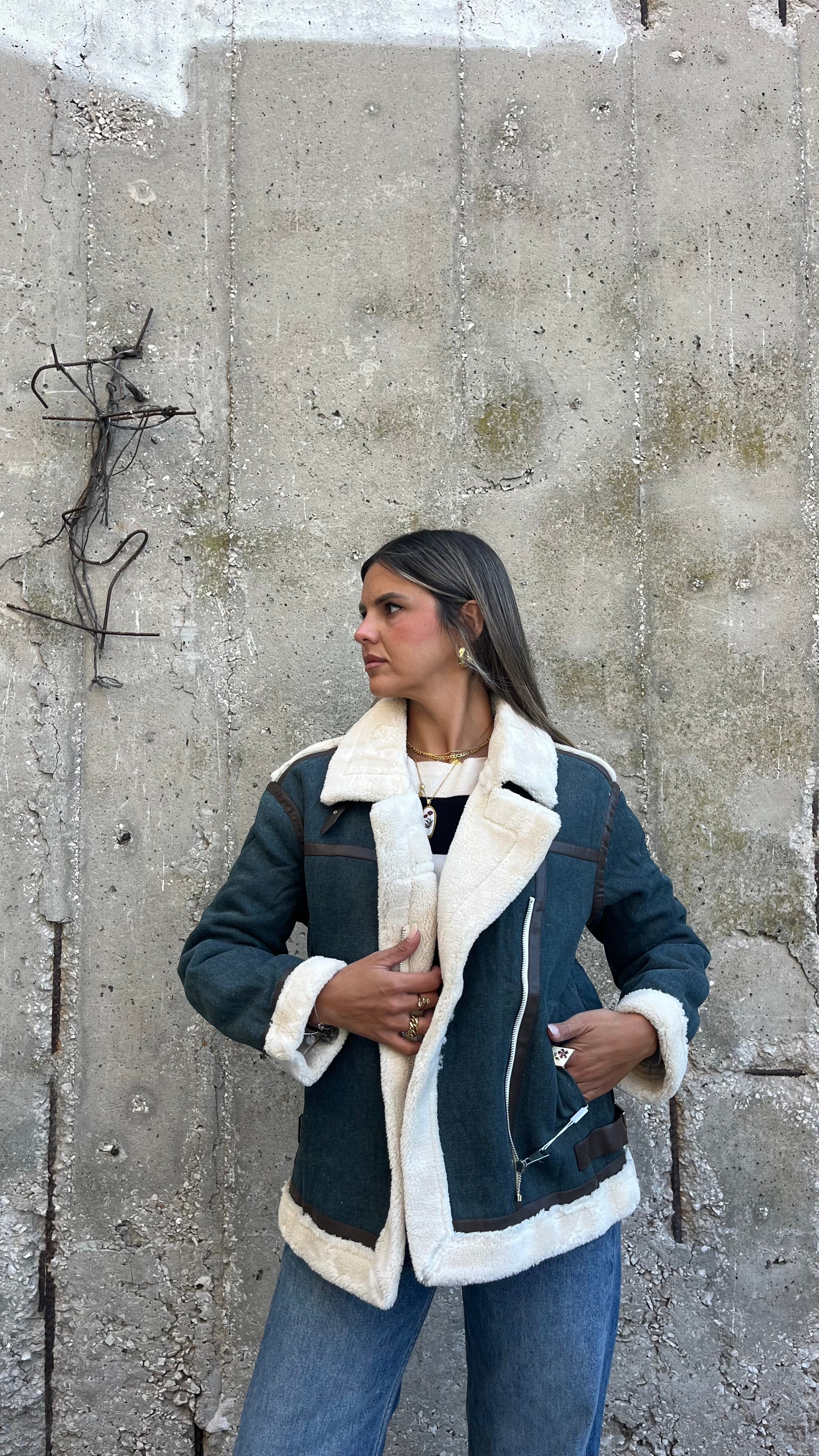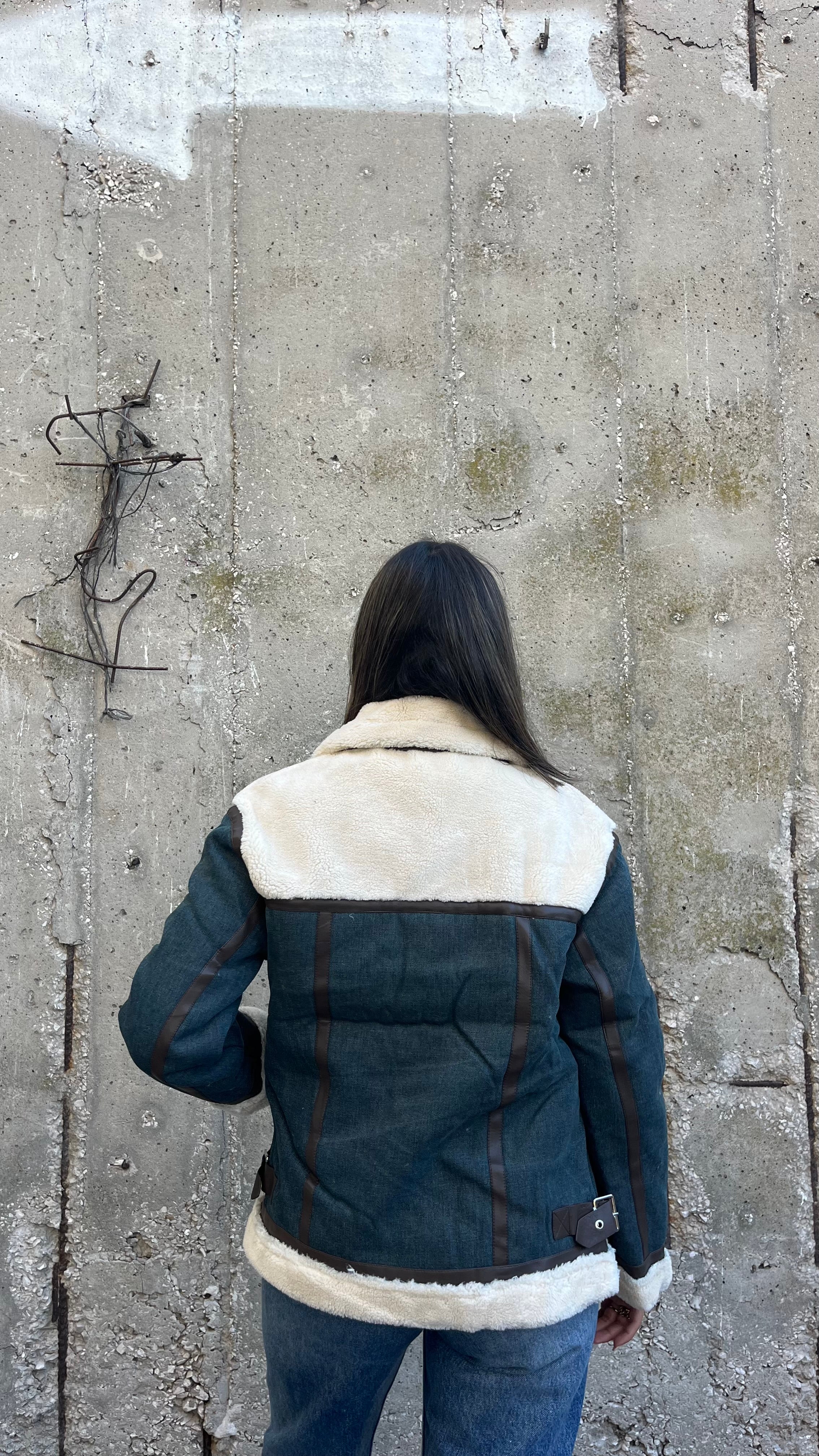 Montone di jeans con inserti in ecopelle marrone . Interno con pelliccia