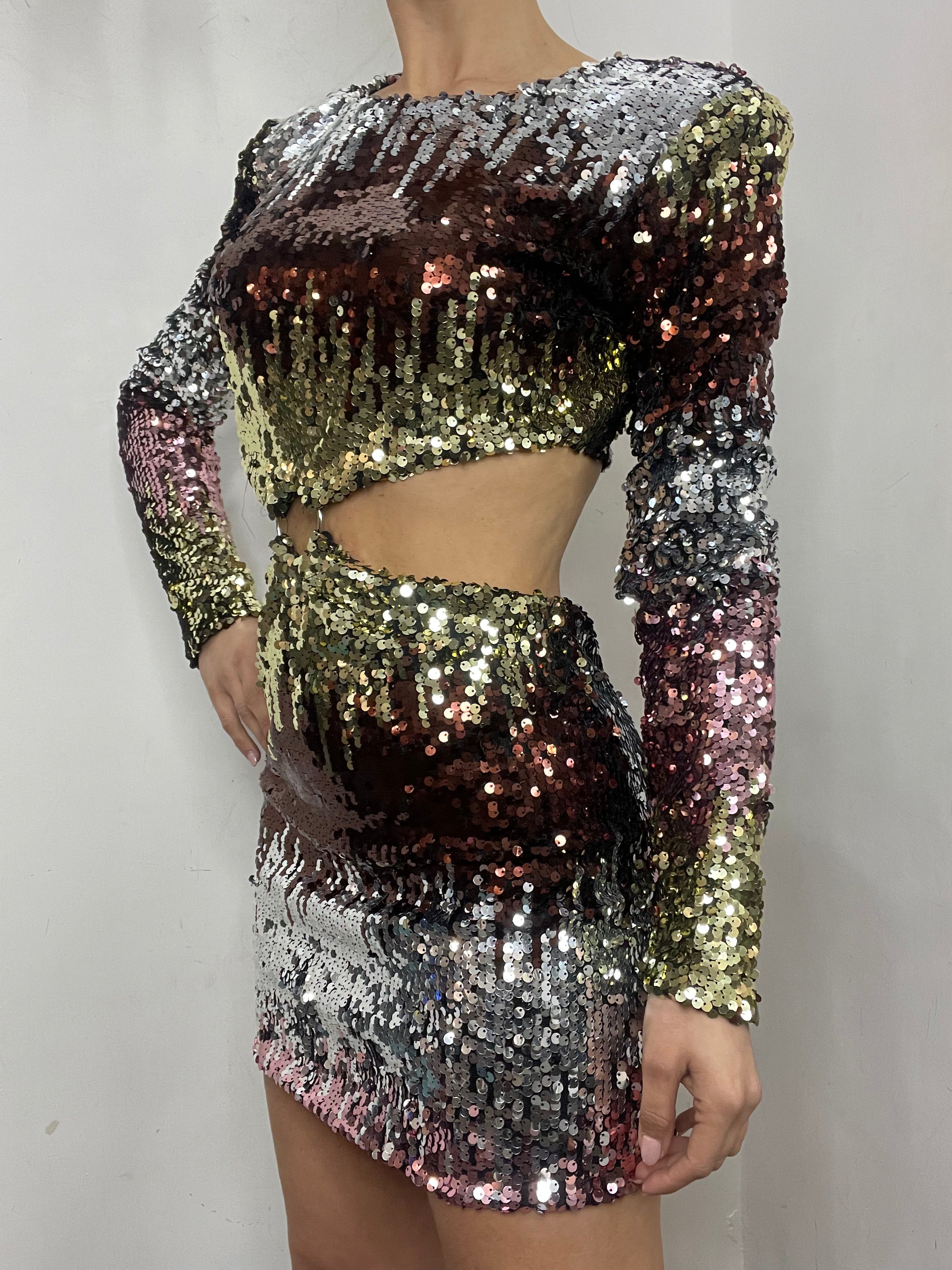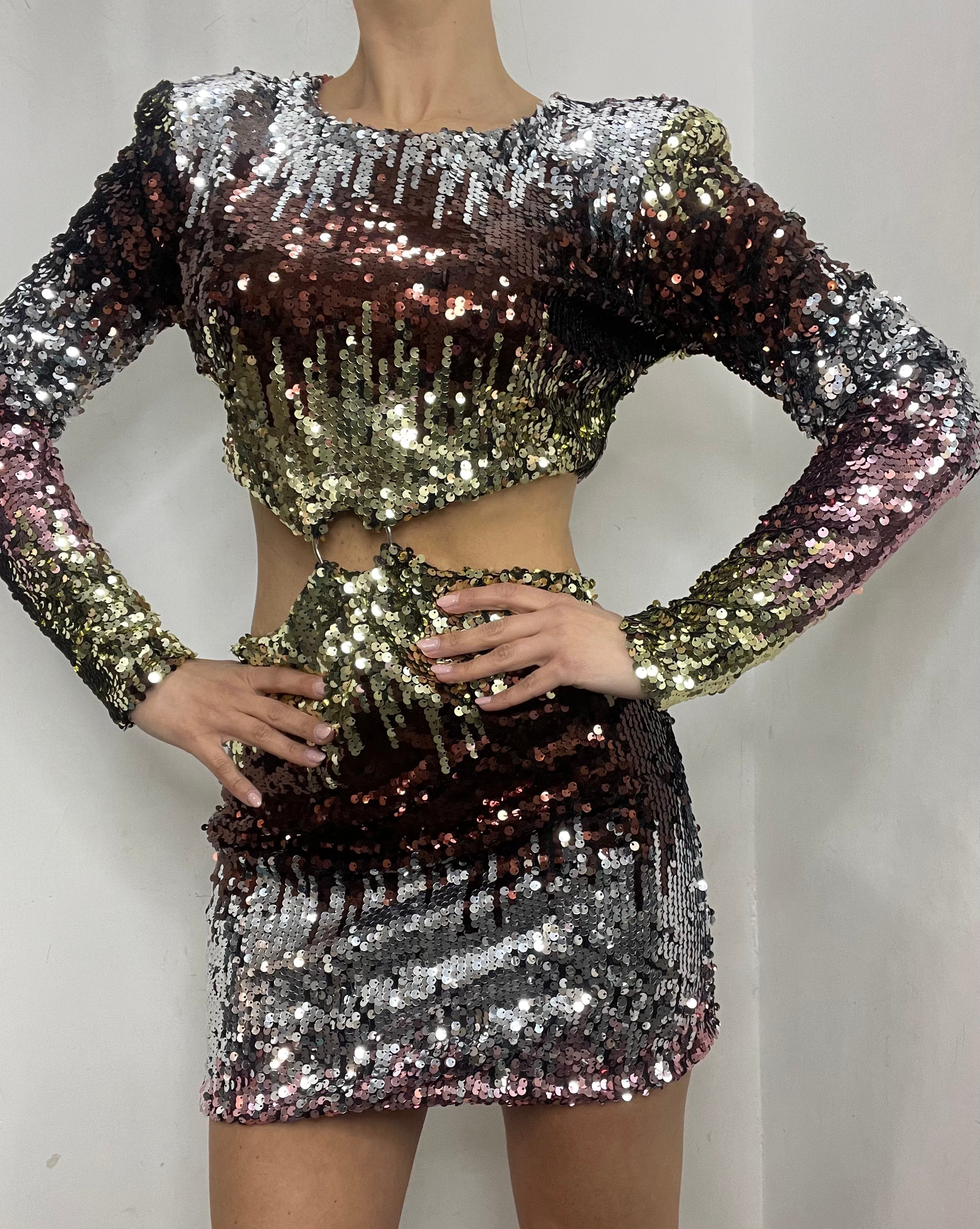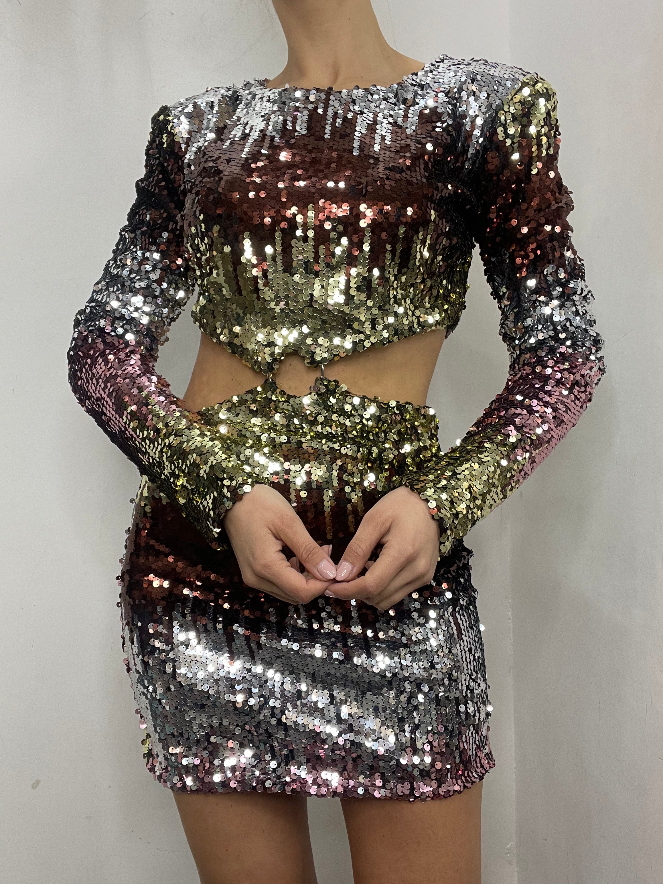 Abito in Pailettes colorate. È foderato, con scollatura sul ventre e dietro la schiena. Chiusura lampo dietro le scapole . Spalline interne. Corto.