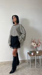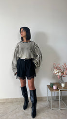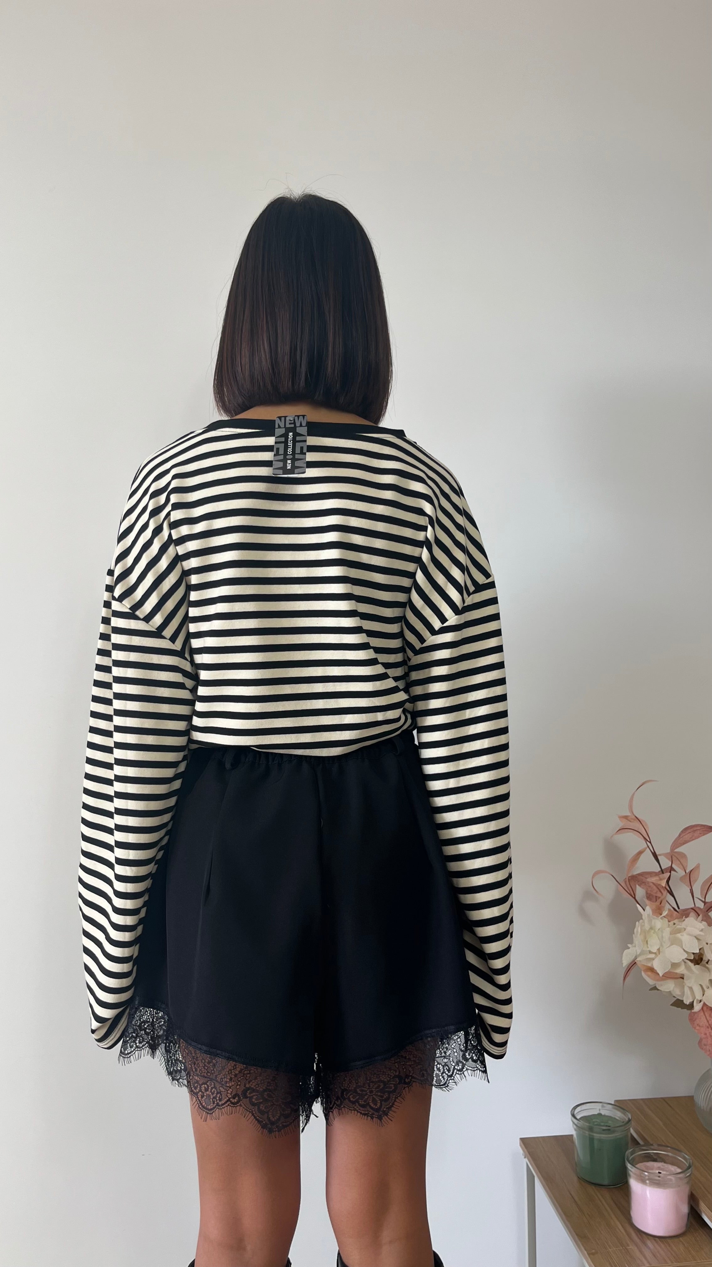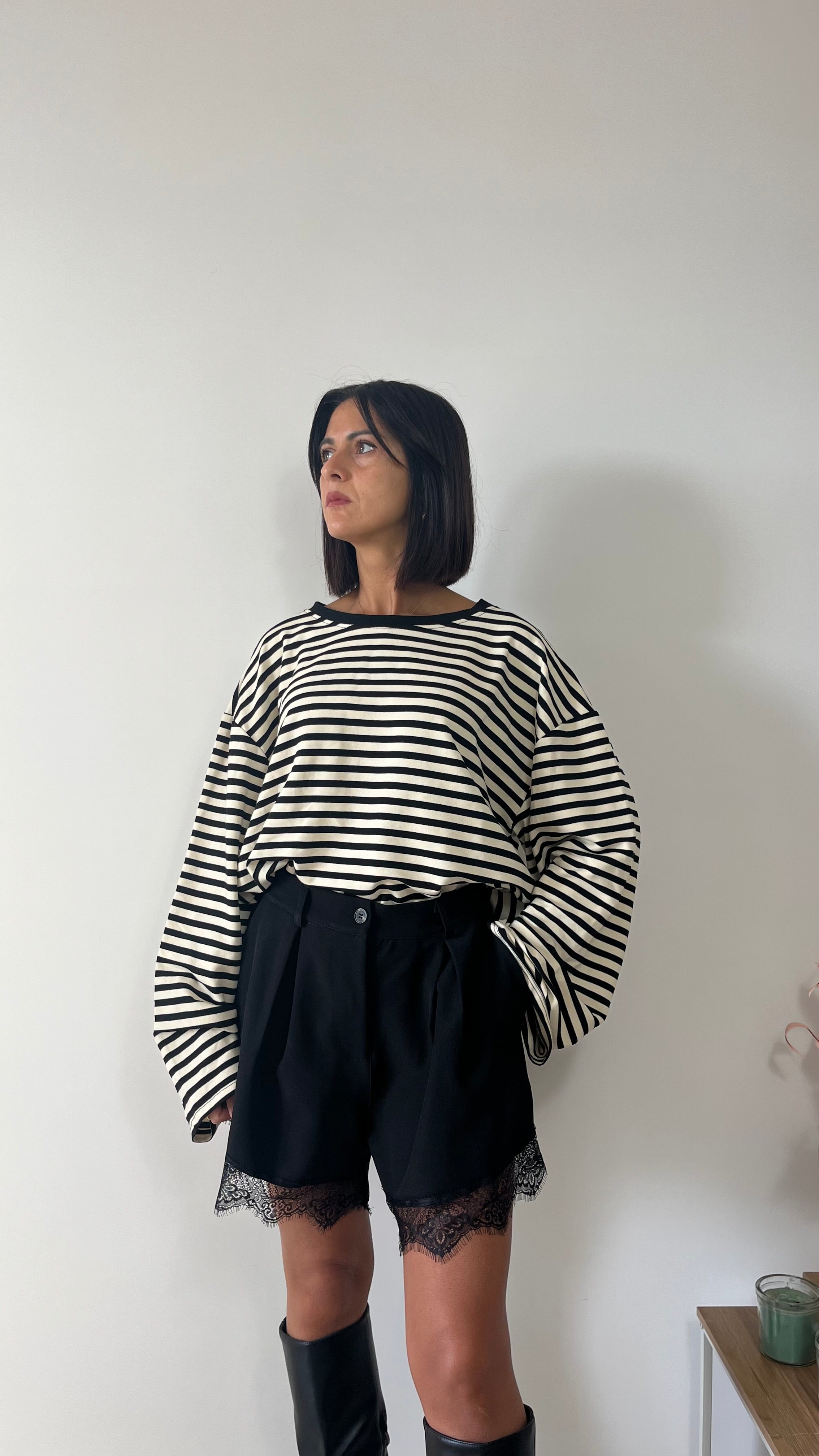 La gamba è larga ed ha il dettaglio in pizzo nero sul bordo.