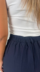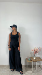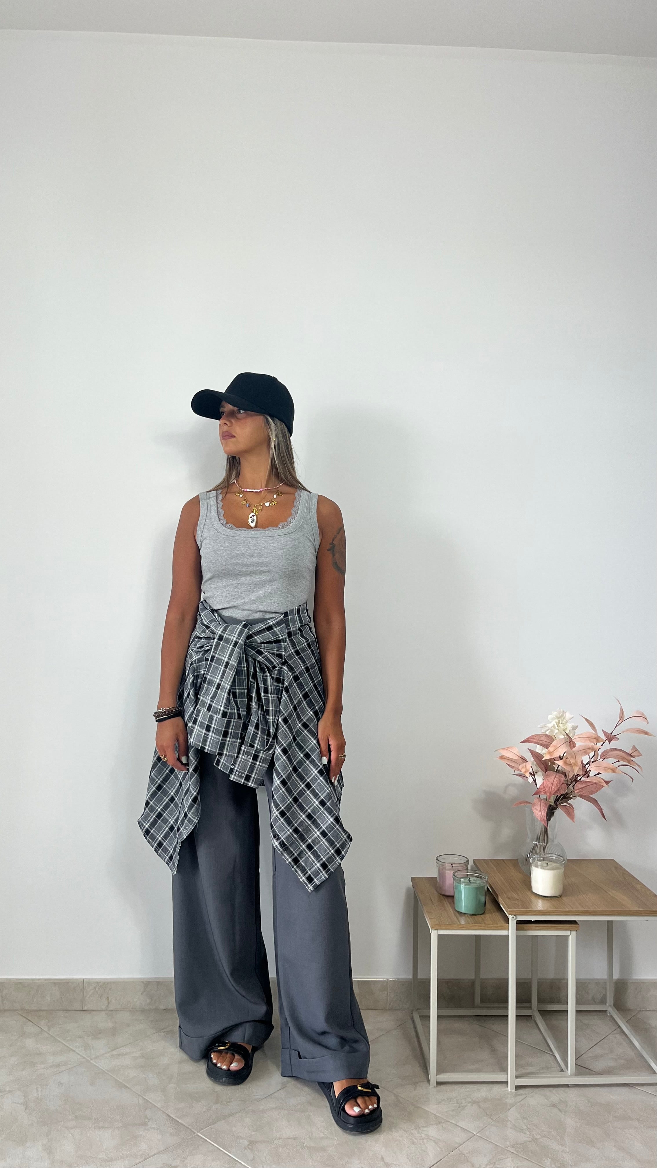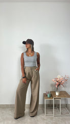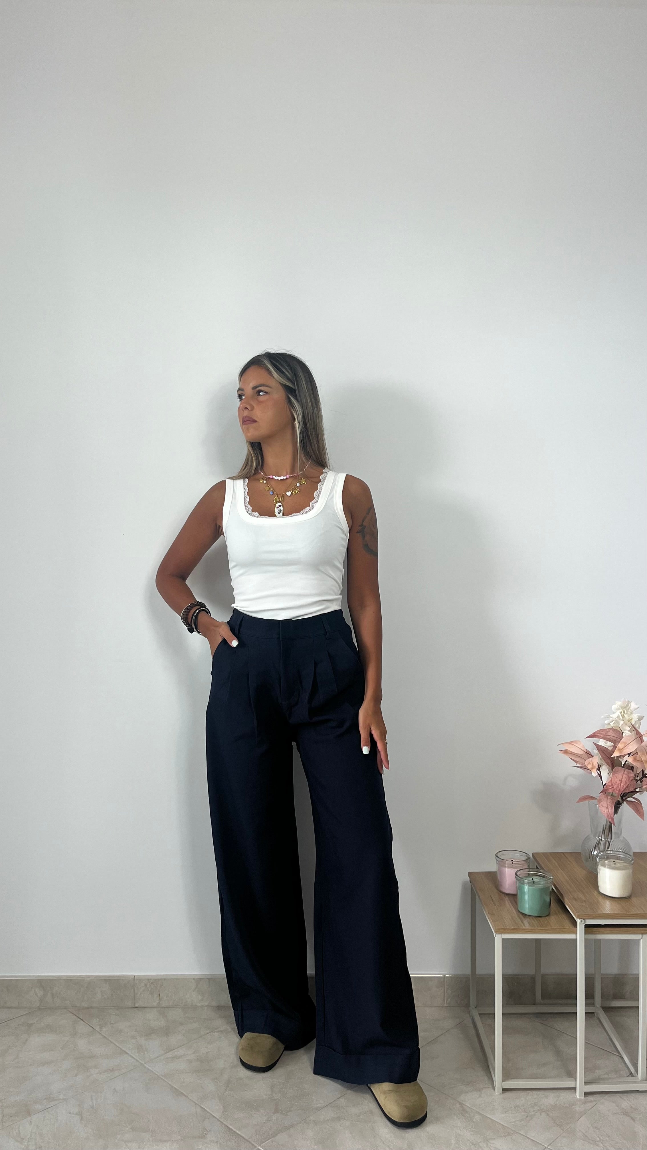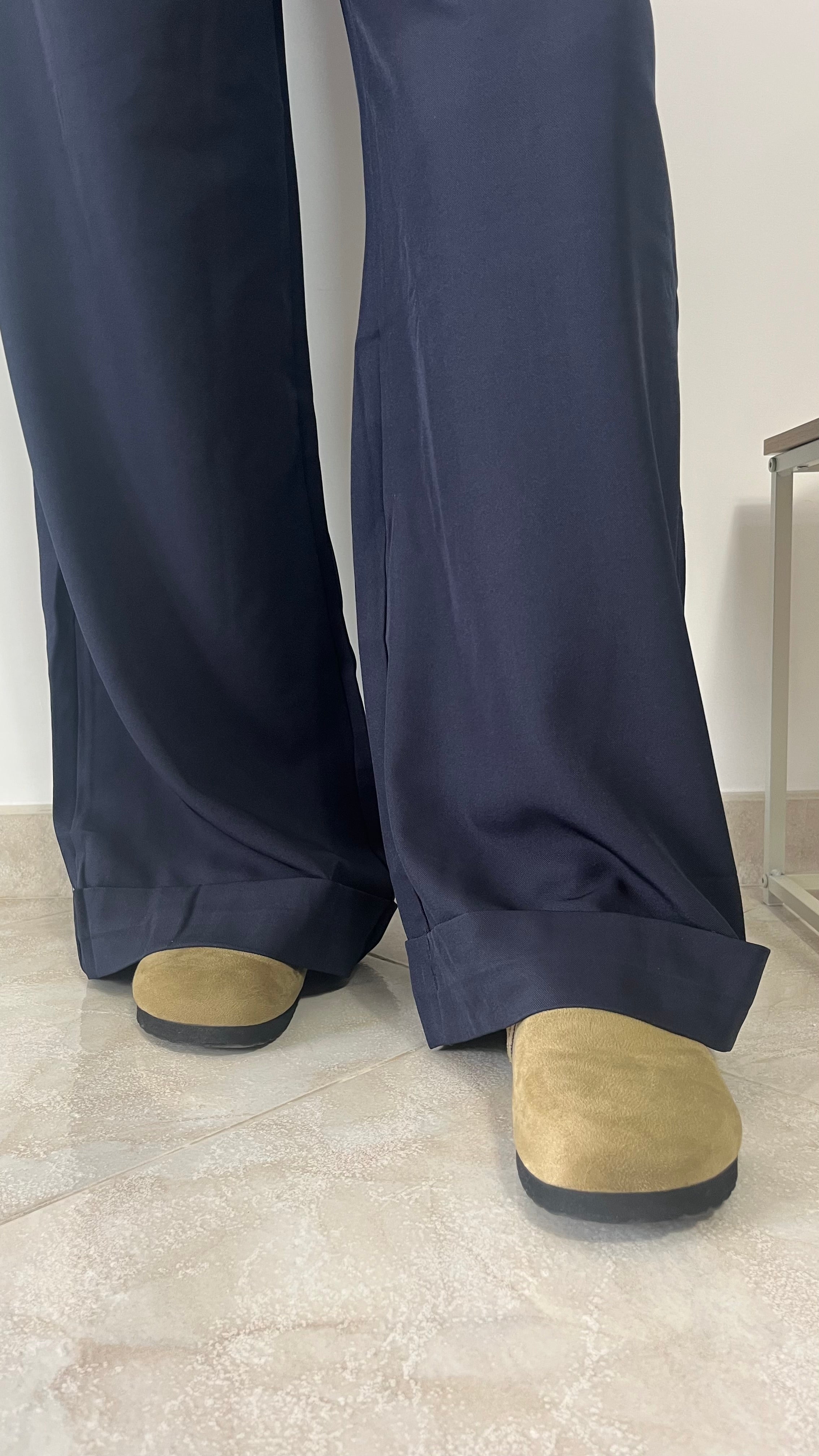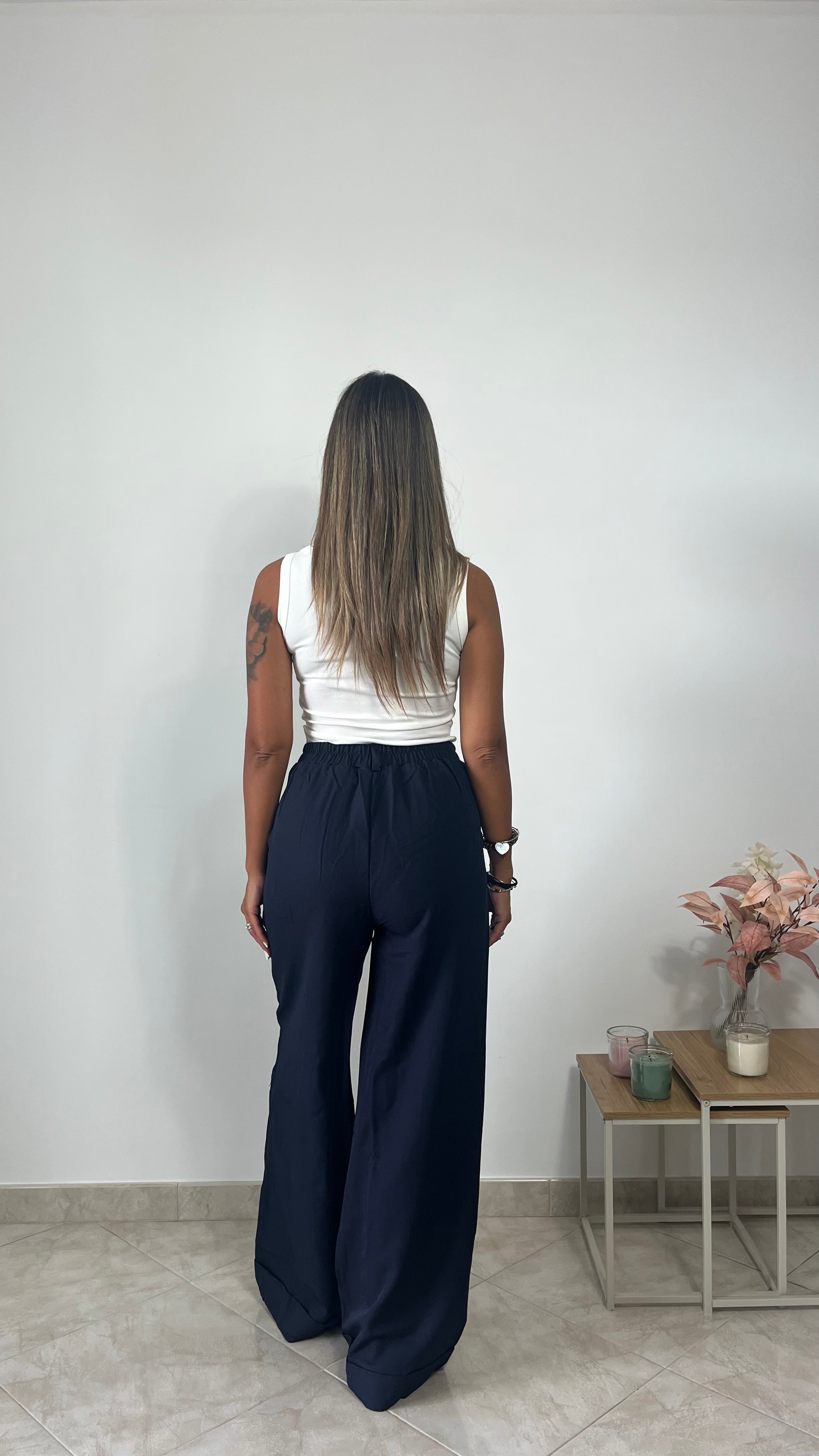Pantaloni modello palazzo con tasche a filo ed elastico dietro la schiena.