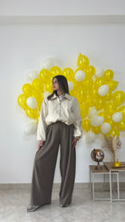 I pantaloni sono un modello ampio e comodo, con vita alta e tasche a lato.