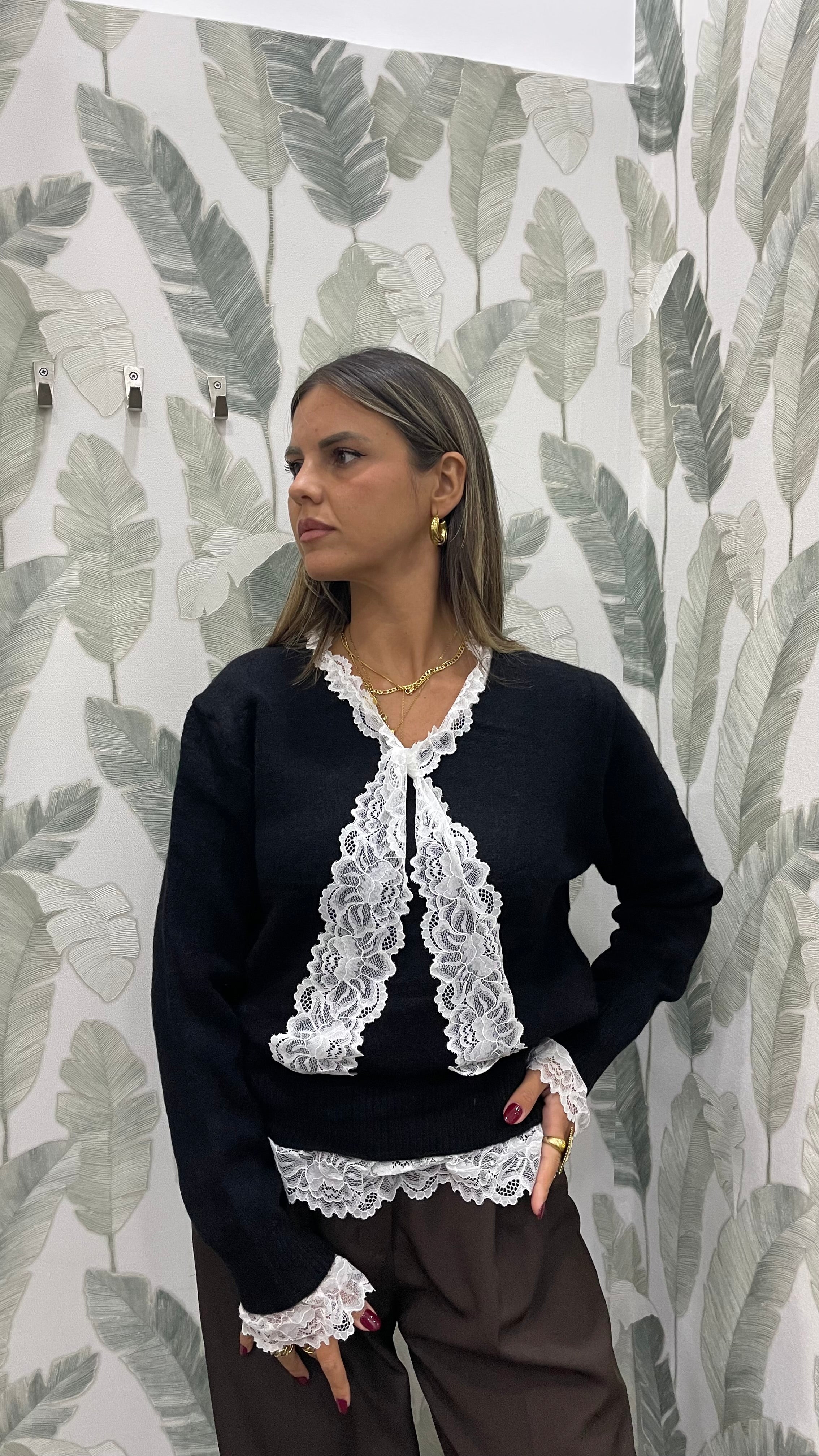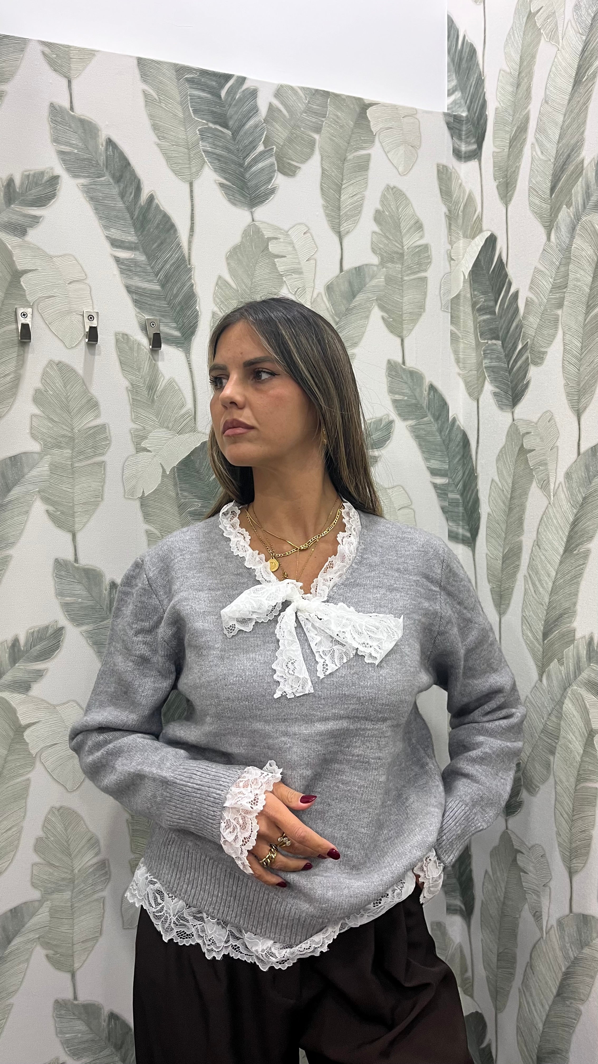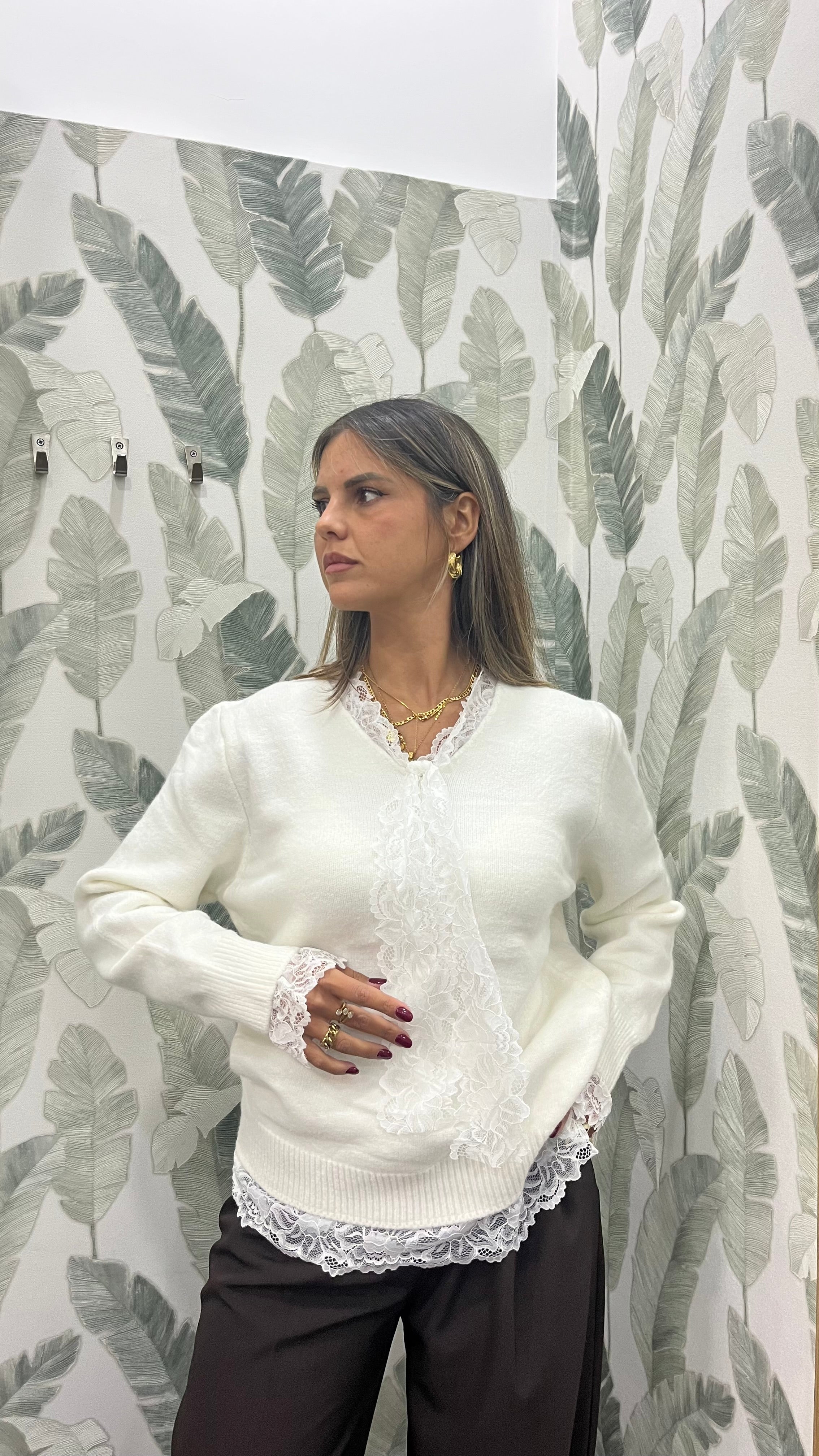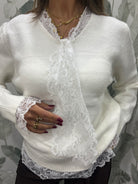 Maglione con scollo a V con dettagli in pizzo su collo, polsi e orlo.