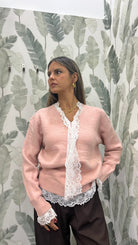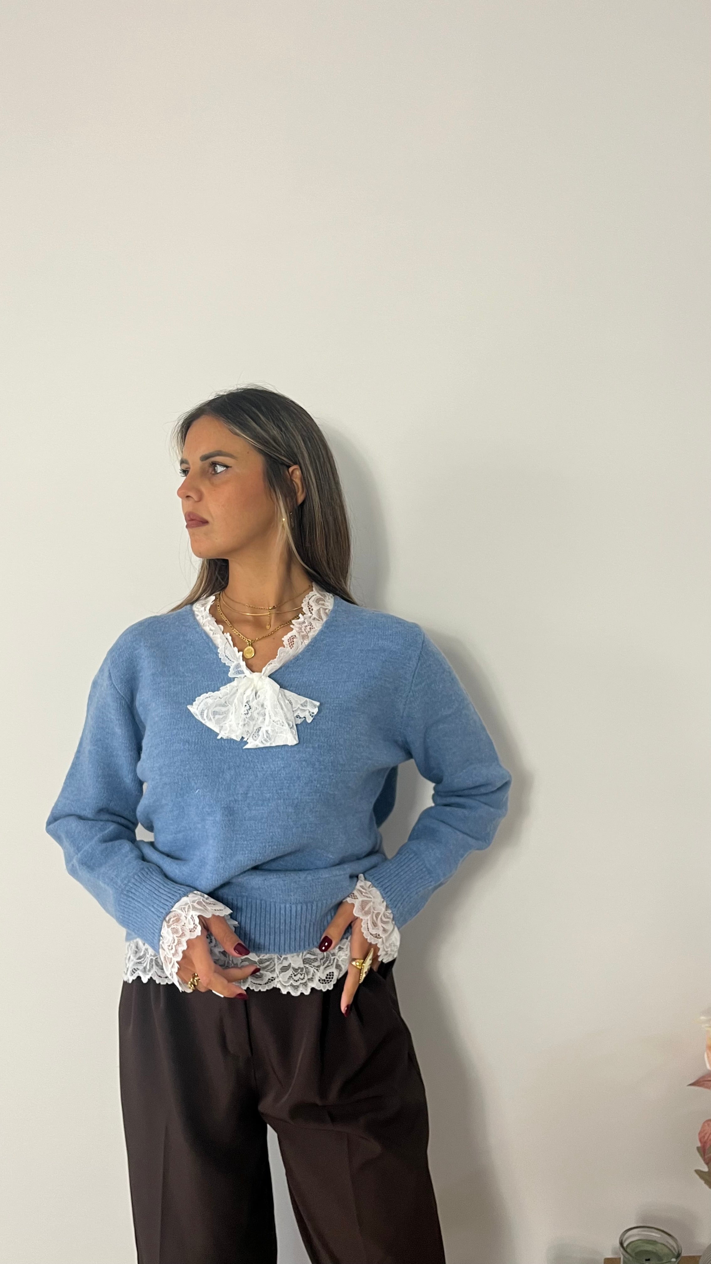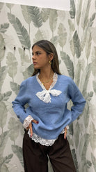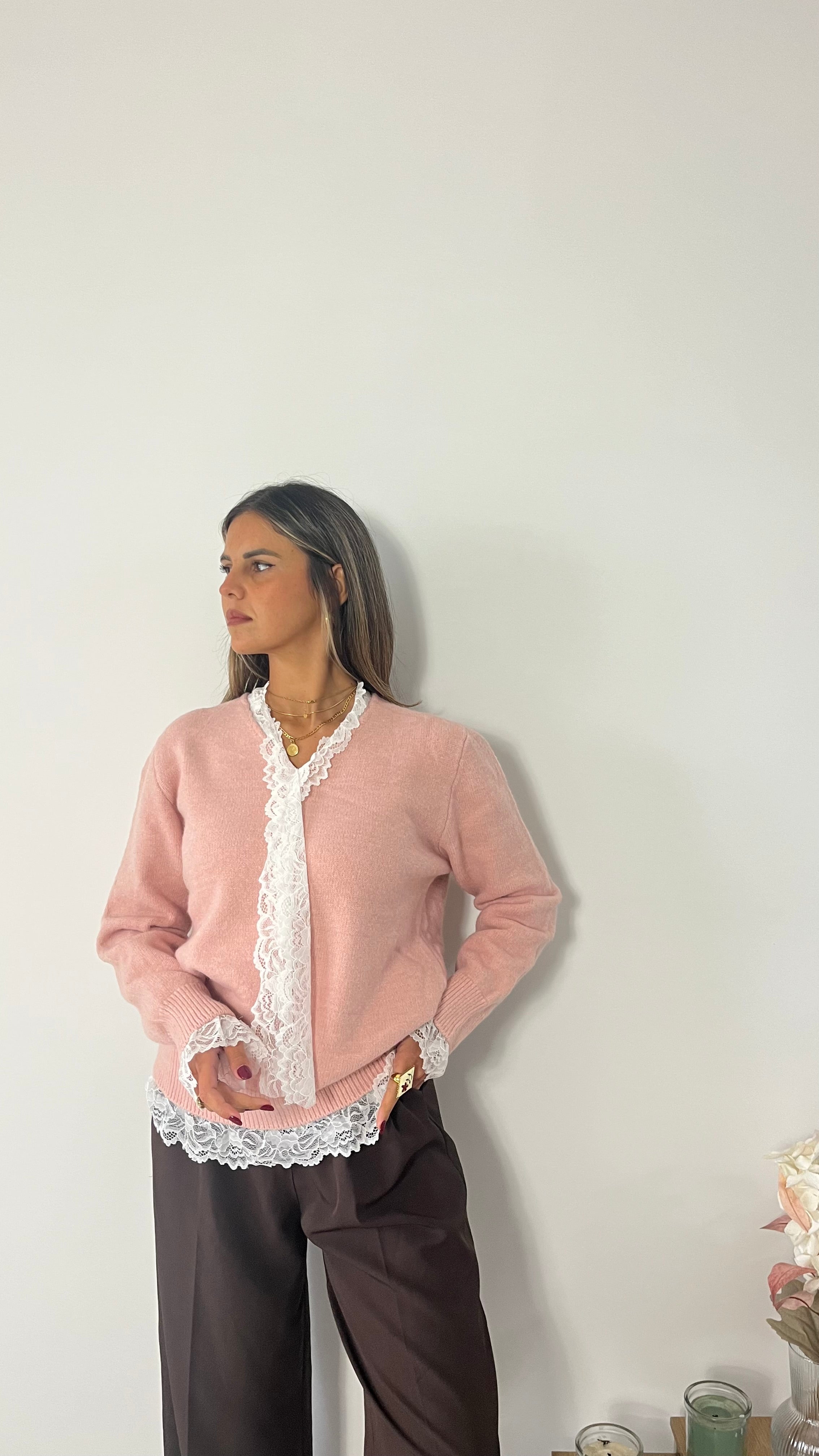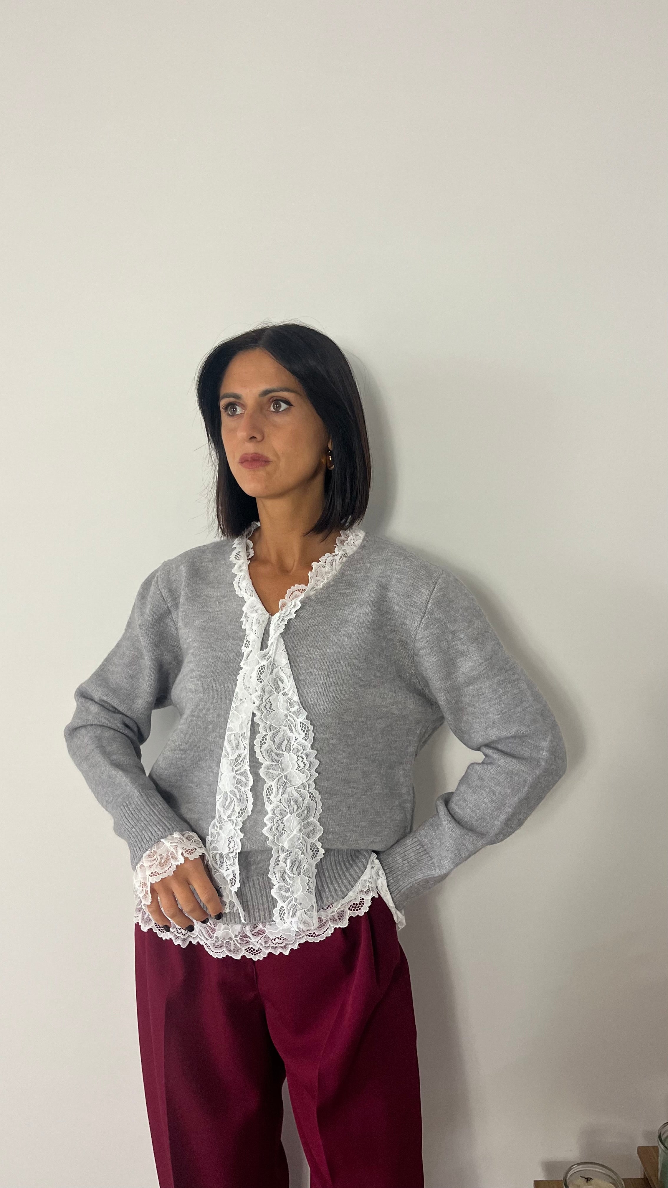 Maglione con scollo a V con dettagli in pizzo su collo, polsi e orlo.