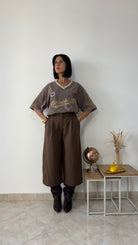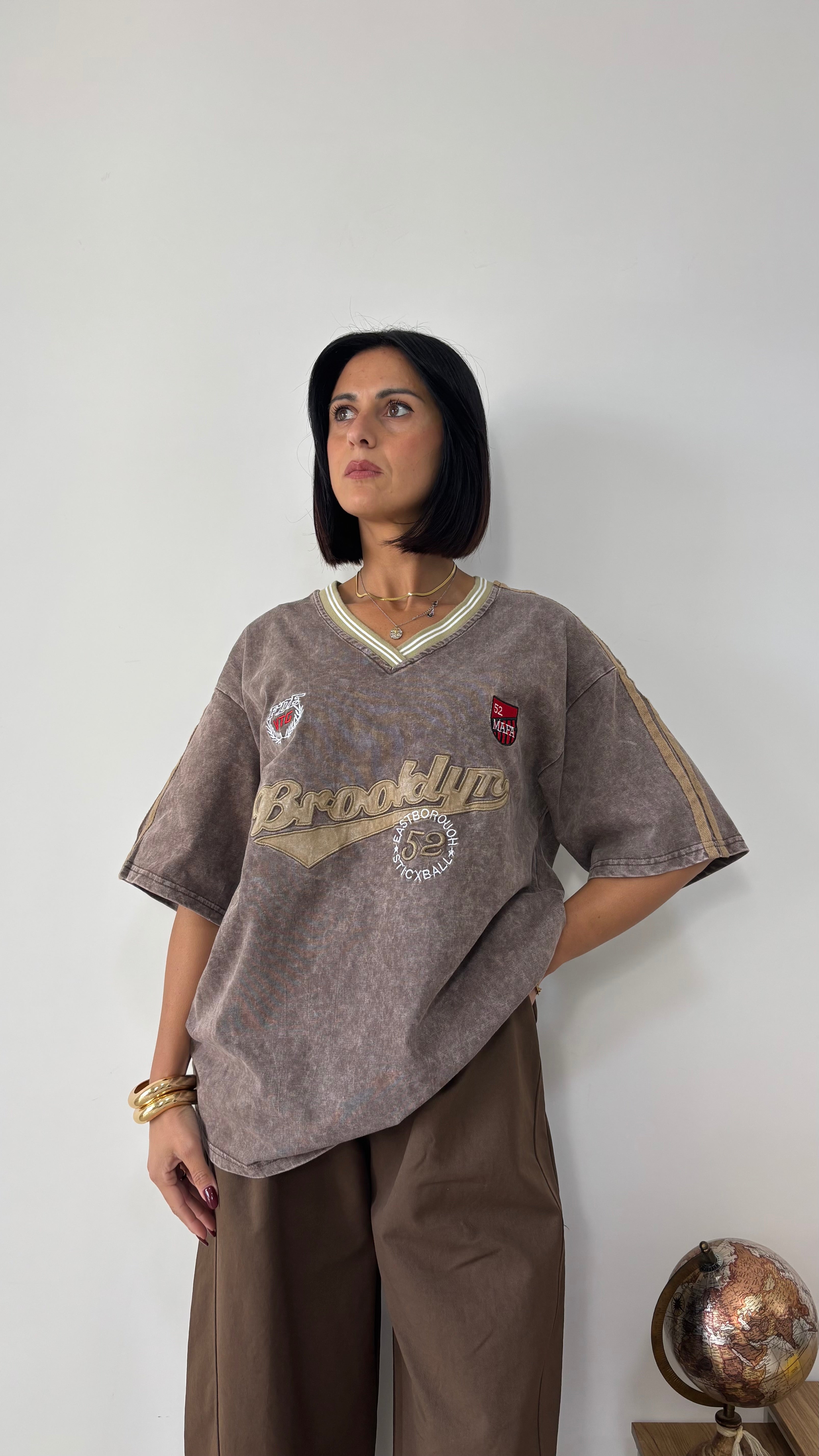 La t-shirt è un modello oversize con scollo a V e mezza manica.