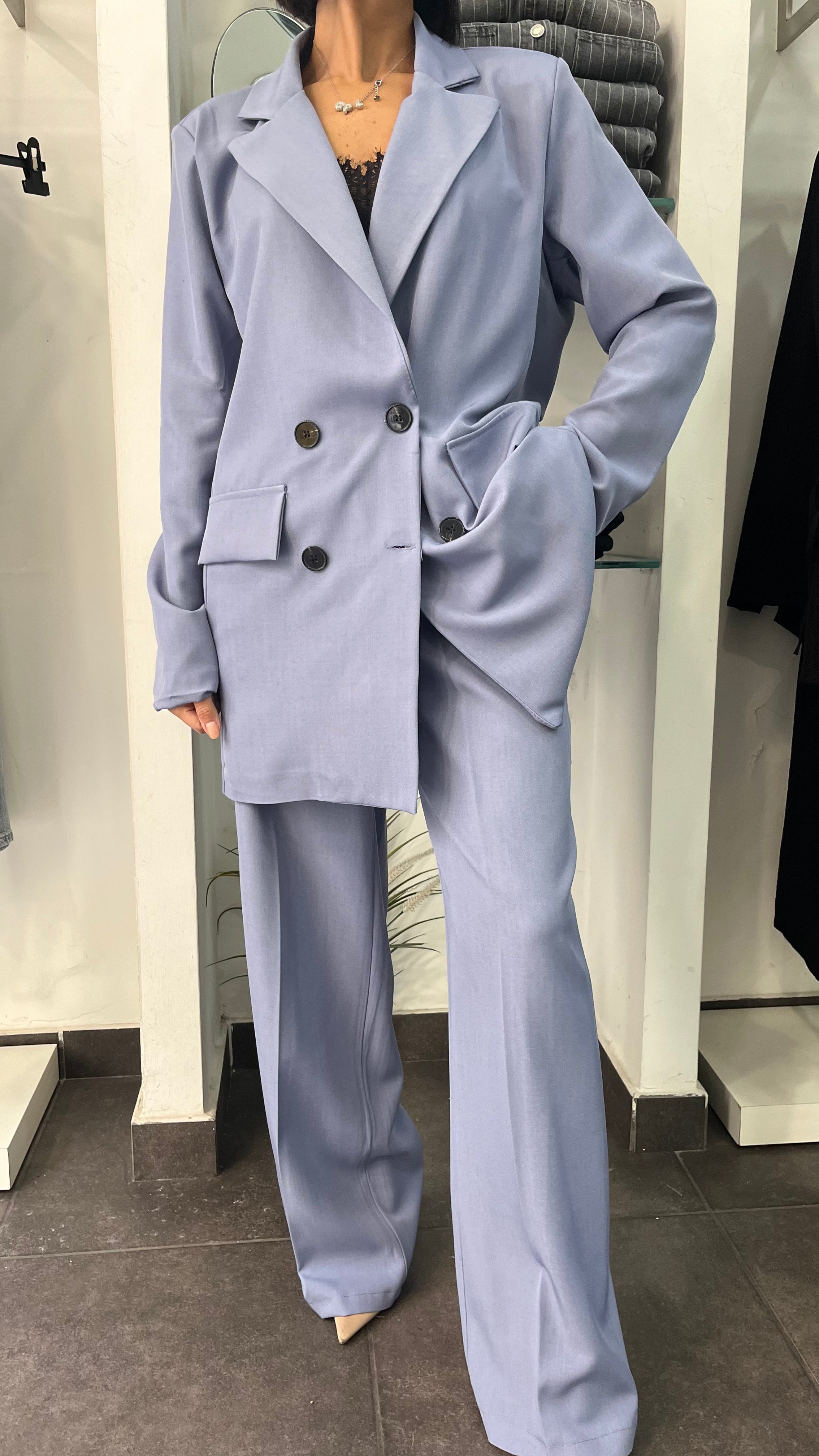 Tailleur taglia unica composto da: giacca con spalline e fodera interna e 4 bottoni; pantaloni gamba larga ed elastico in vita sulla parte posteriore,vita alta.